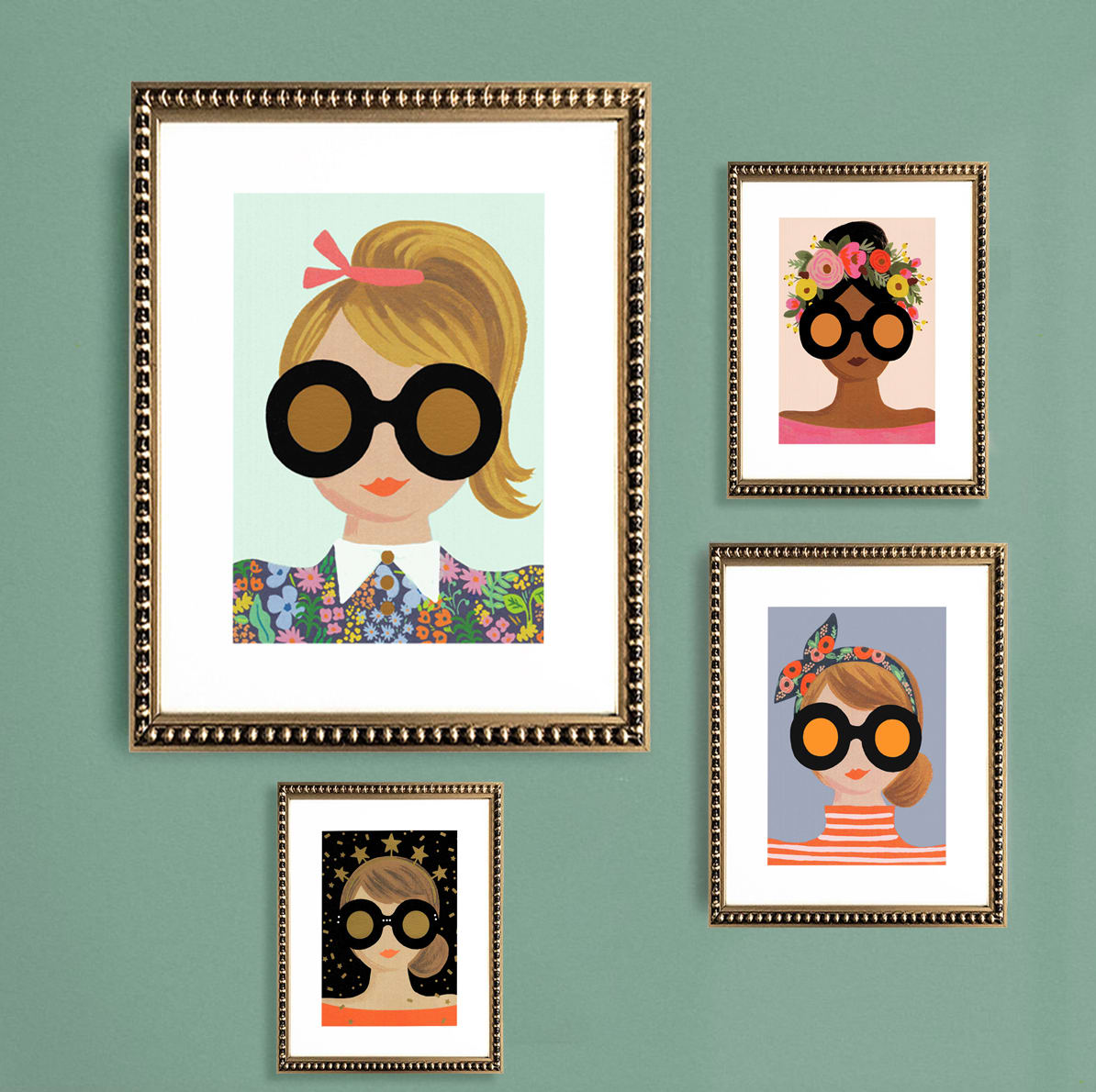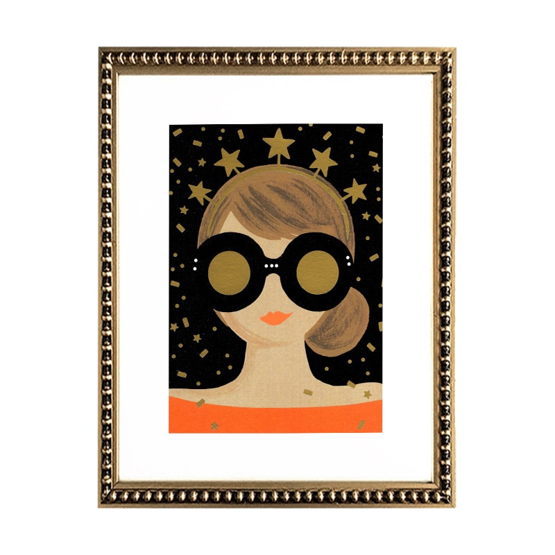 Cuadro con lámina impresa de ilustración de mujer, paspartú blanco y marco delgado de perlas color dorado.