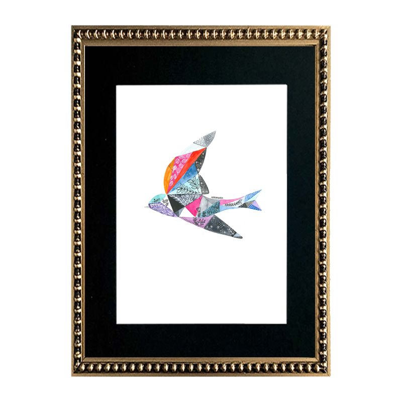 Cuadro reproducción golondrina geométrica en acuarela y pluma, paspartú negro con marco perlas dorado.