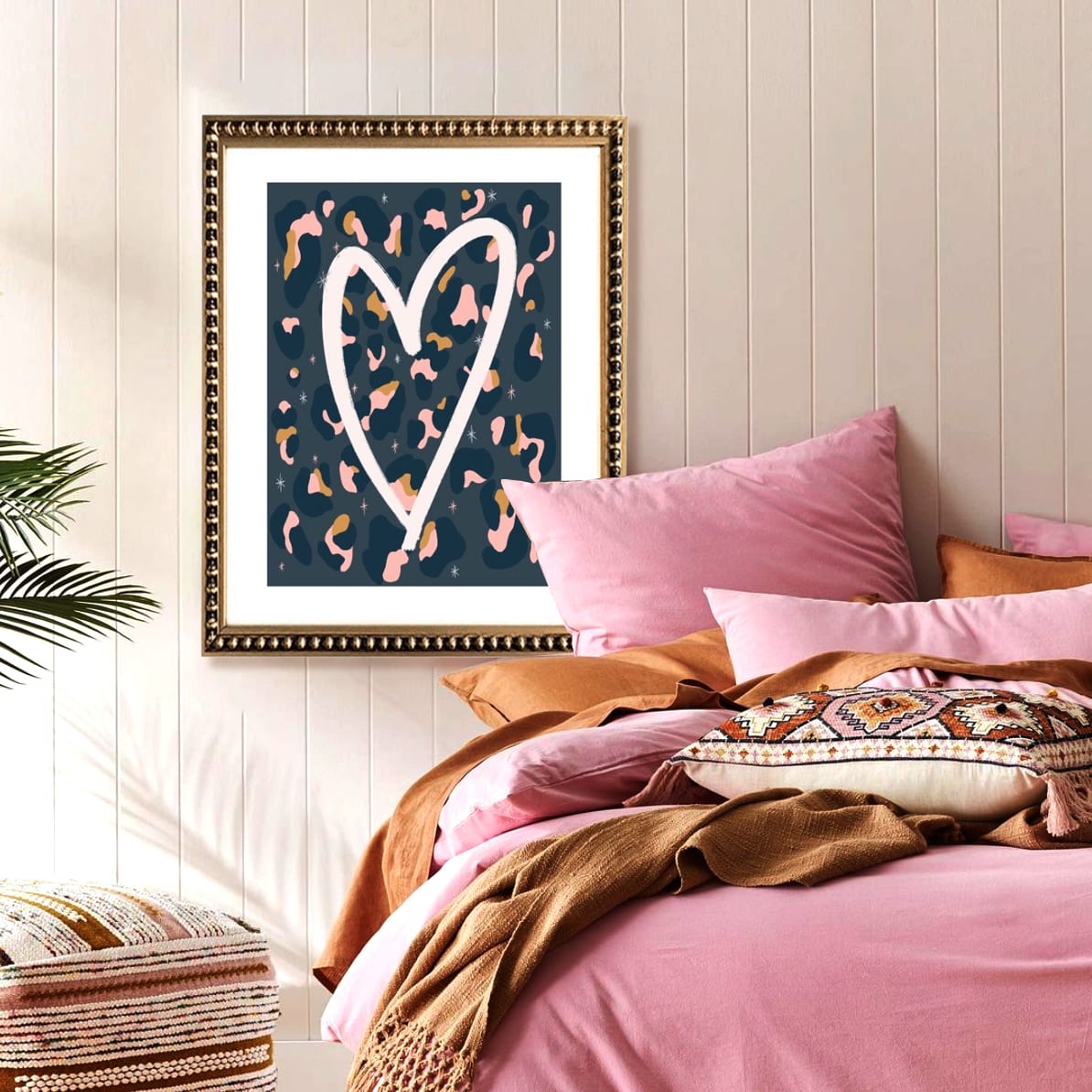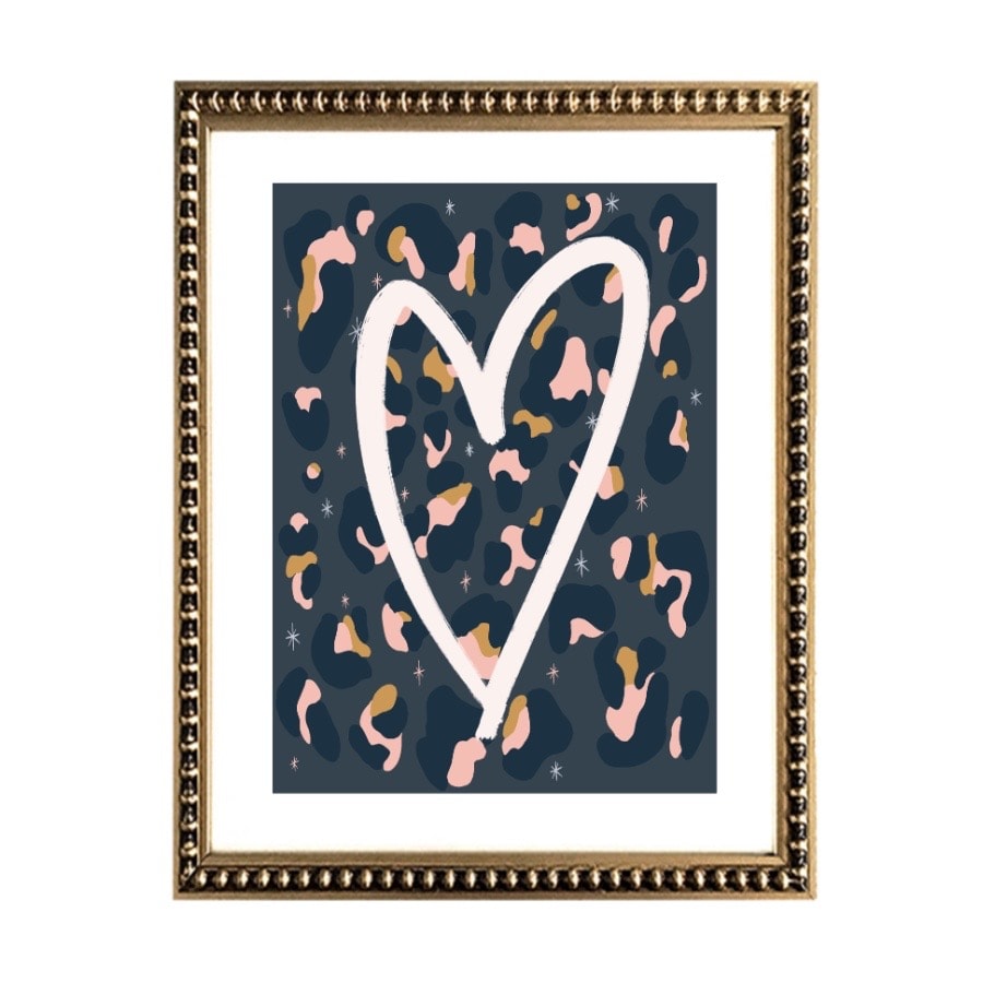 Cuadro de ilustración de corazón blanco en fondo animal print gris topo, paspartú blanco y marco de madera con perlas color dorado envejecido.
