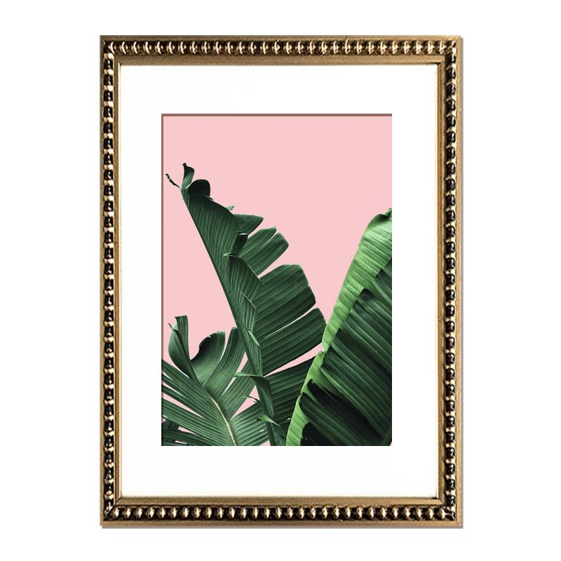 Cuadro reproducción digital de hoja plátano con fondo rosa, paspartú blanco y marco de perlas dorado.