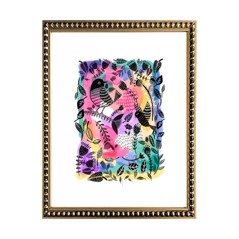 Cuadro de ilustración de pájaros en blanco & negro en fondo de colores, paspartú blanco y marco perla oro.