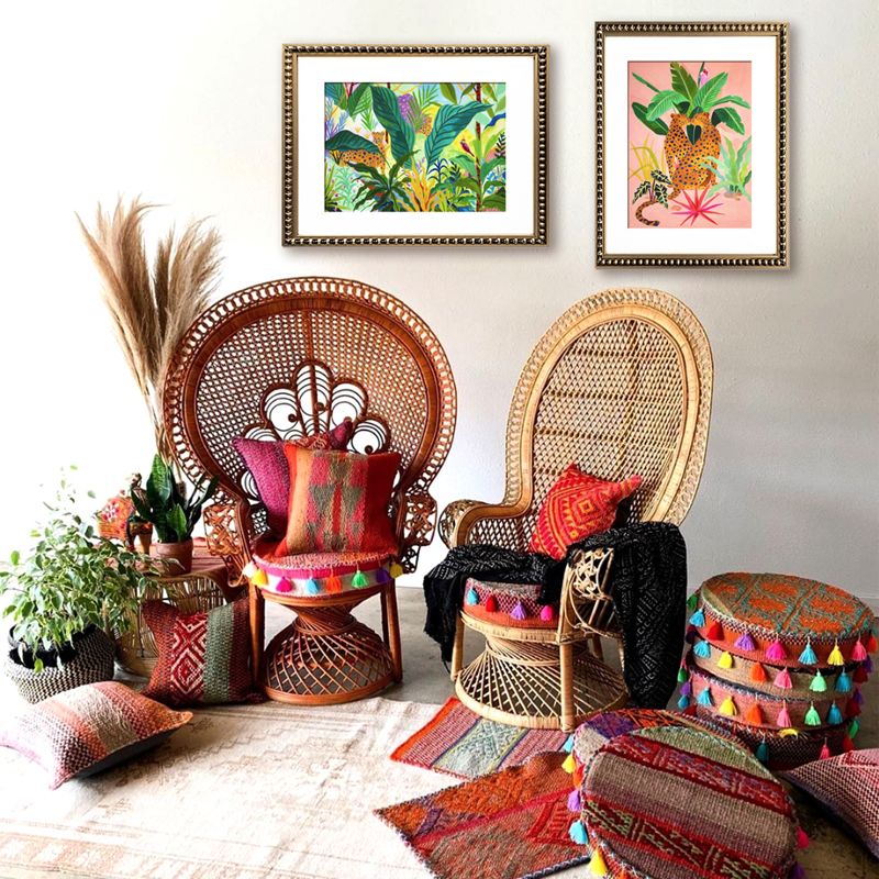 Cuadro reproducción de ilustración de animales en jungla, con paspartú blanco y marco perla oro.