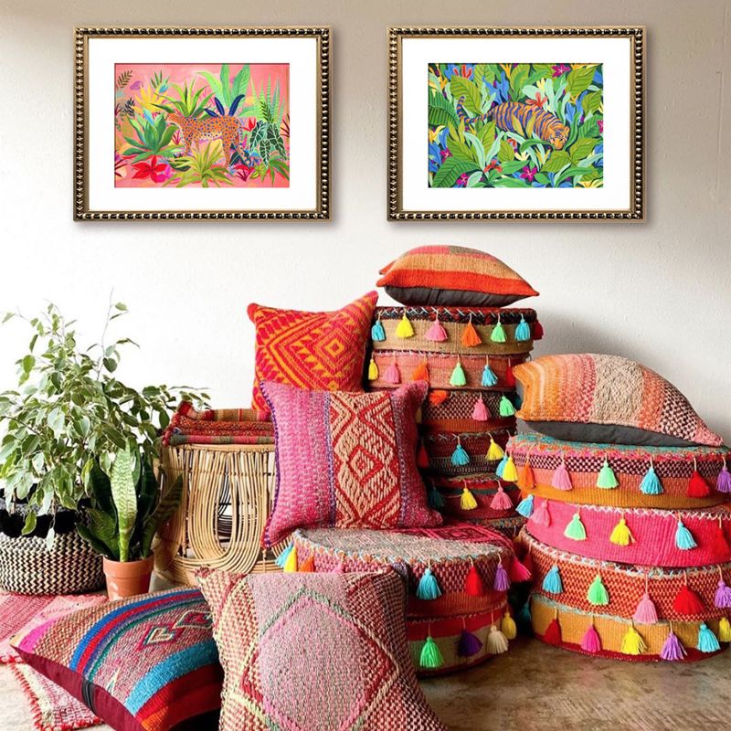Cuadro ilustración leopardo en la jungla rosa, con paspartú blanco y marco perla oro.