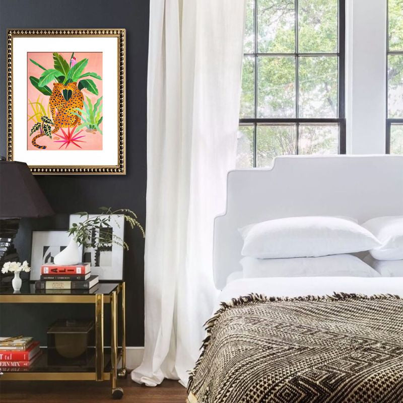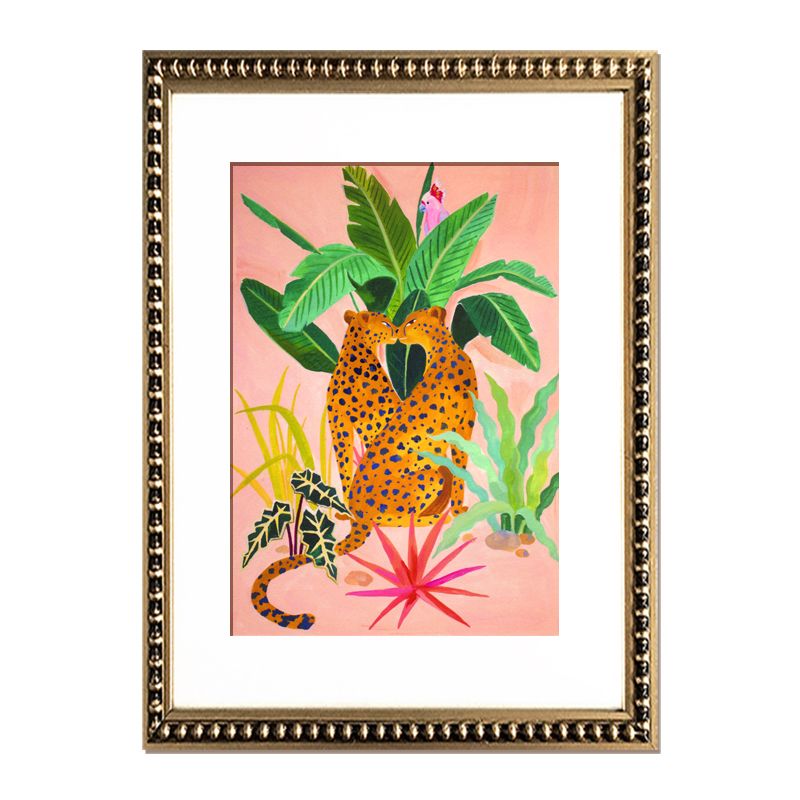 Cuadro ilustración pareja de leopardos en jungla rosa, con paspartú blanco y marco perla oro.