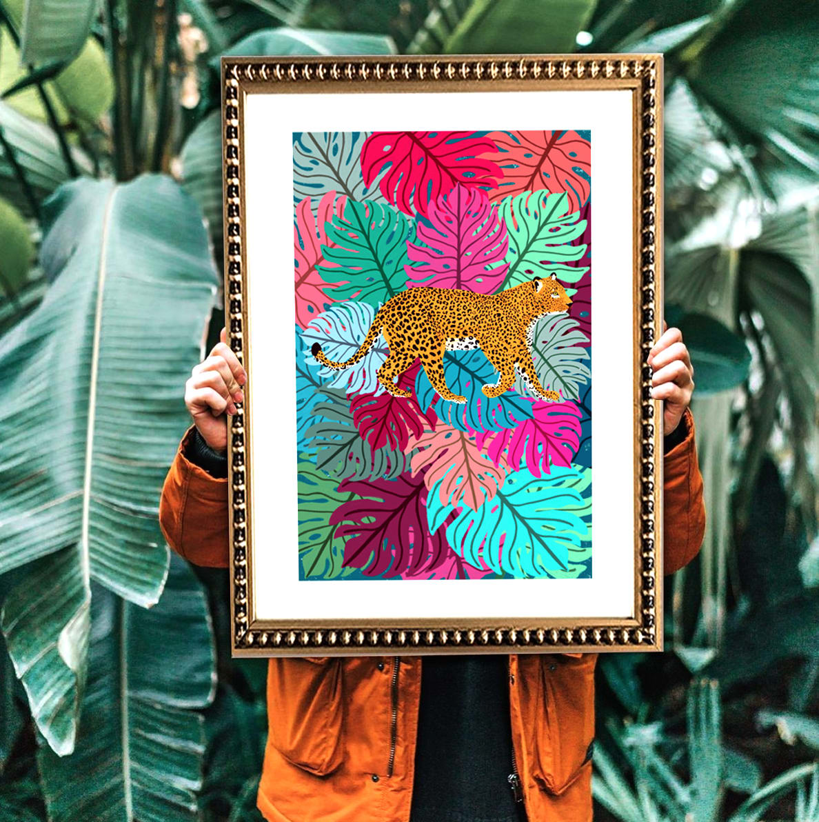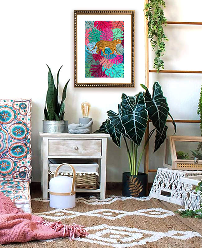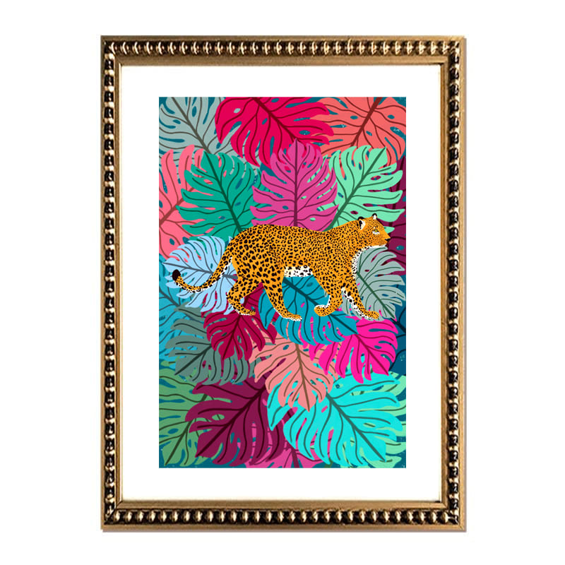 Cuadro de ilustración digital de leopardo en fondo de monsteras de colores, paspartú blanco y marco de madera con perlas color dorado.