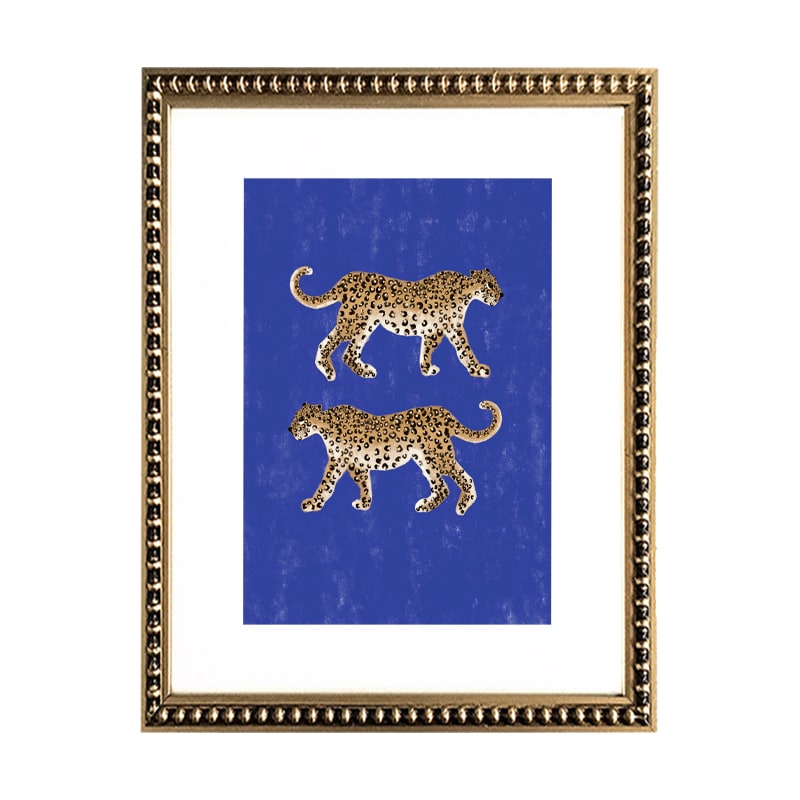 Cuadro de pareja de leopardos en fondo azul, paspartú blanco y marco de madera con perlas color dorado.