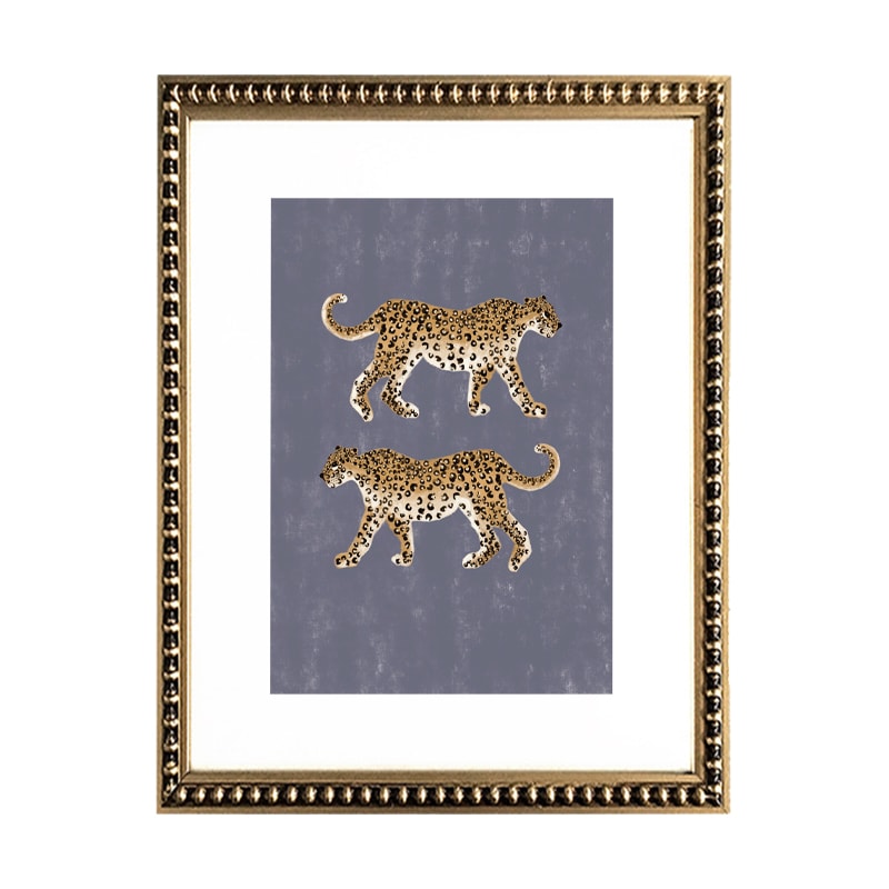 Cuadro de pareja de leopardos en fondo gris, paspartú blanco y marco de madera con perlas color dorado.