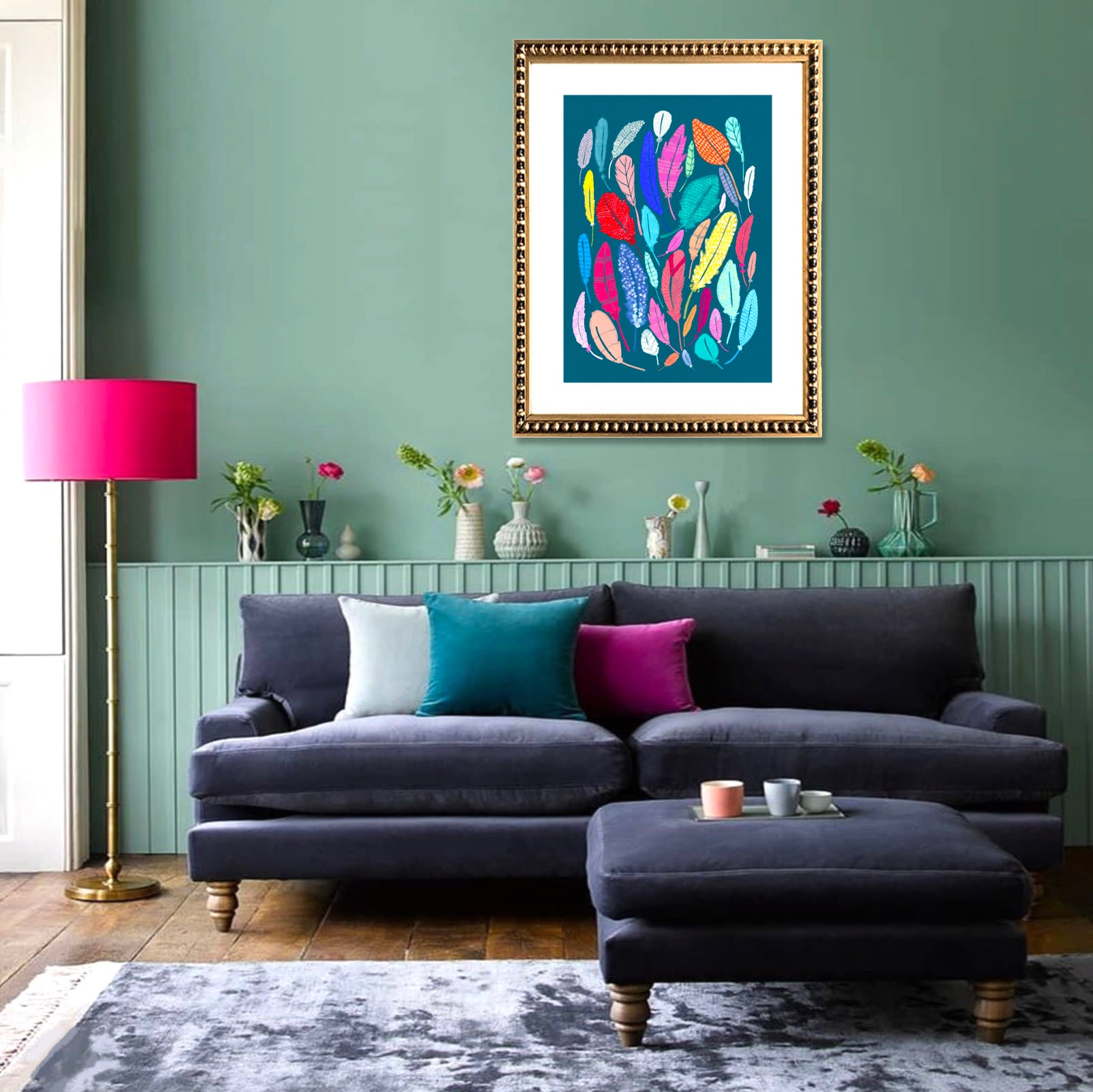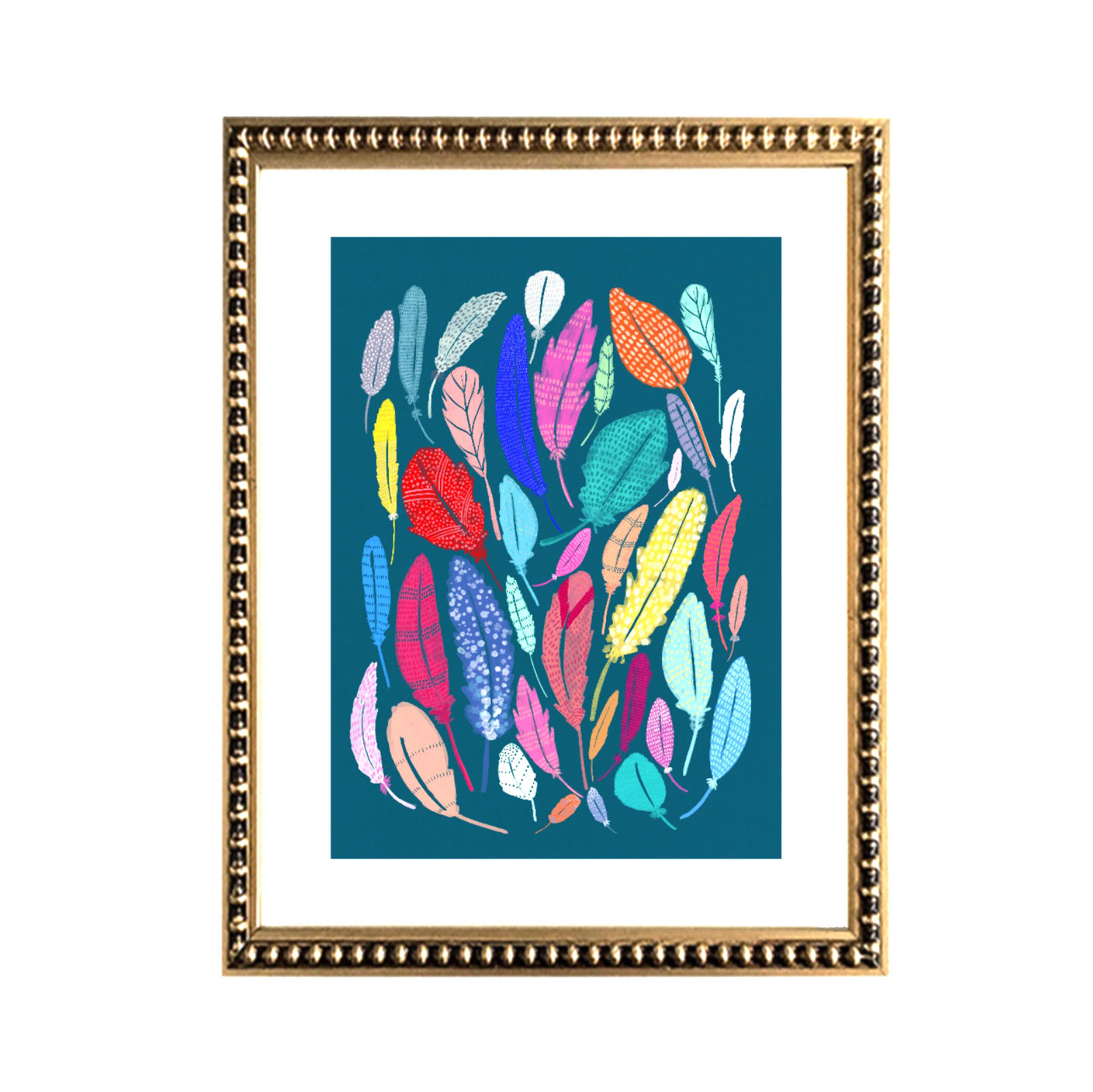 Cuadro de plumas en colores sobre fondo verde, paspartú blanco y marco de madera con perlitas dorado.