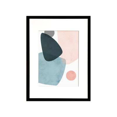 Cuadro con diseño nórdico en colores azul y rosa, con paspartú blanco y marco negro liso delgado.