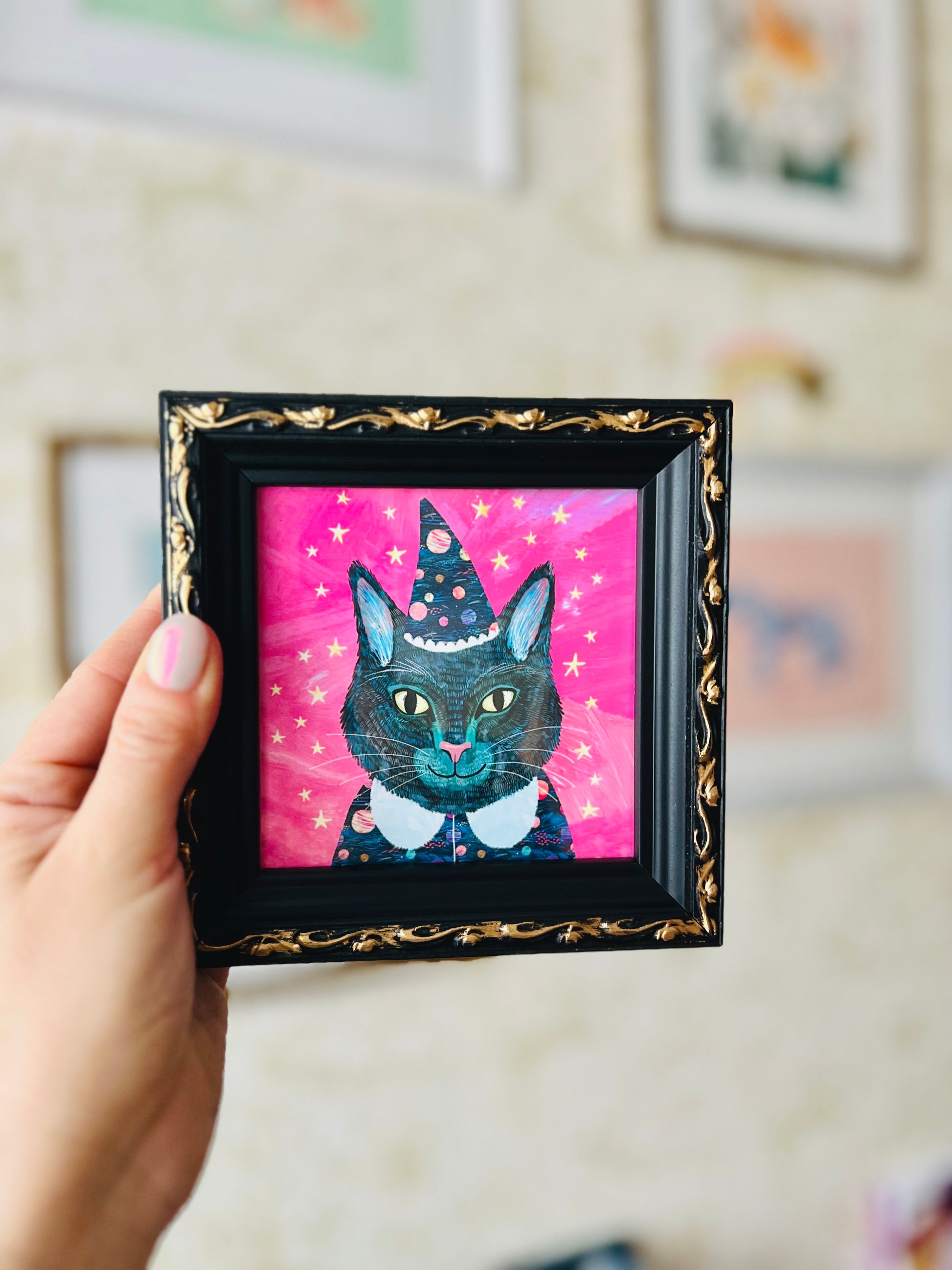 Mini cuadrito con diseño de animales en colores en marco de madera negro con detalles dorados.