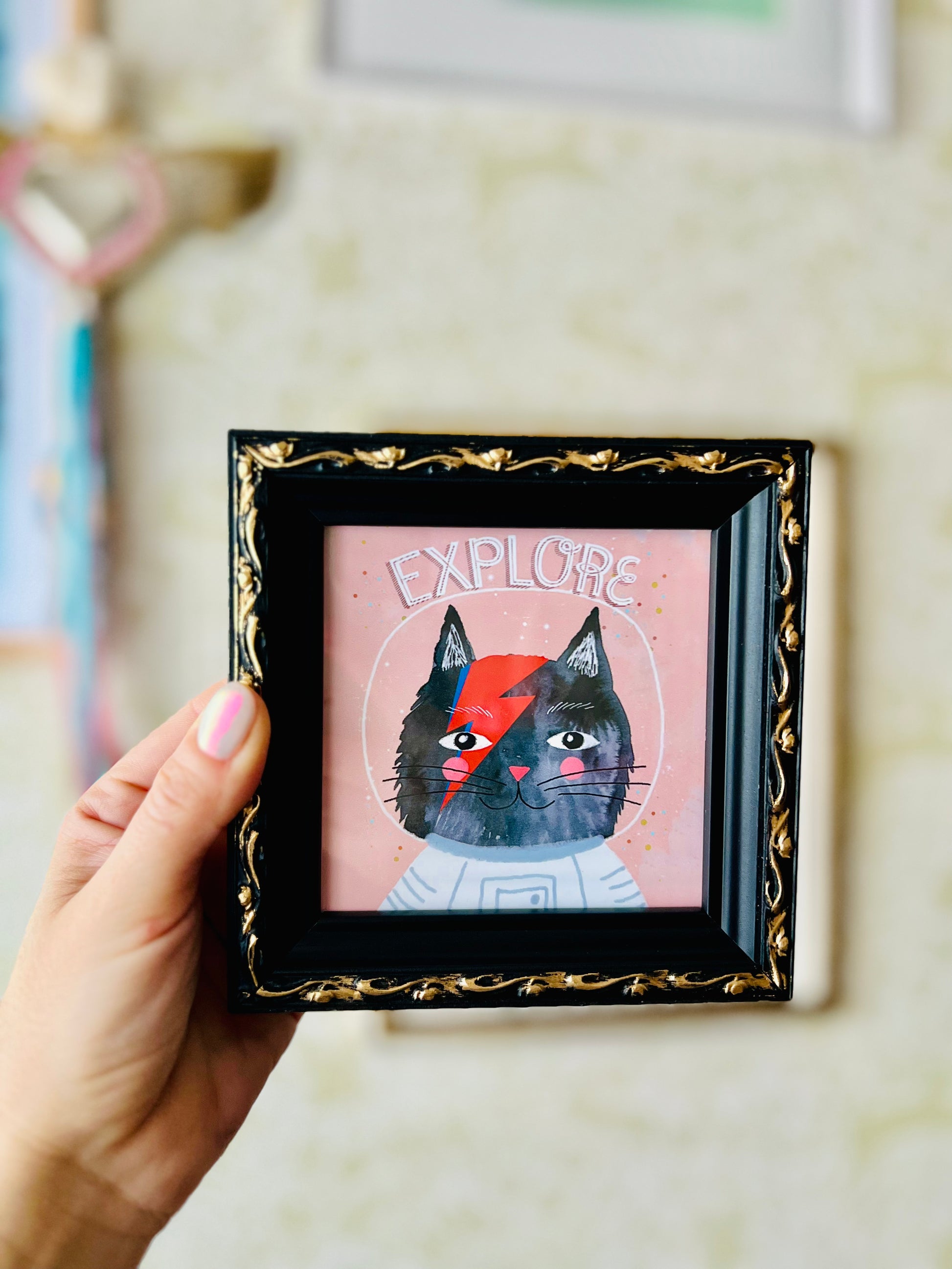 Mini cuadrito con diseño de animales en colores en marco de madera negro con detalles dorados.