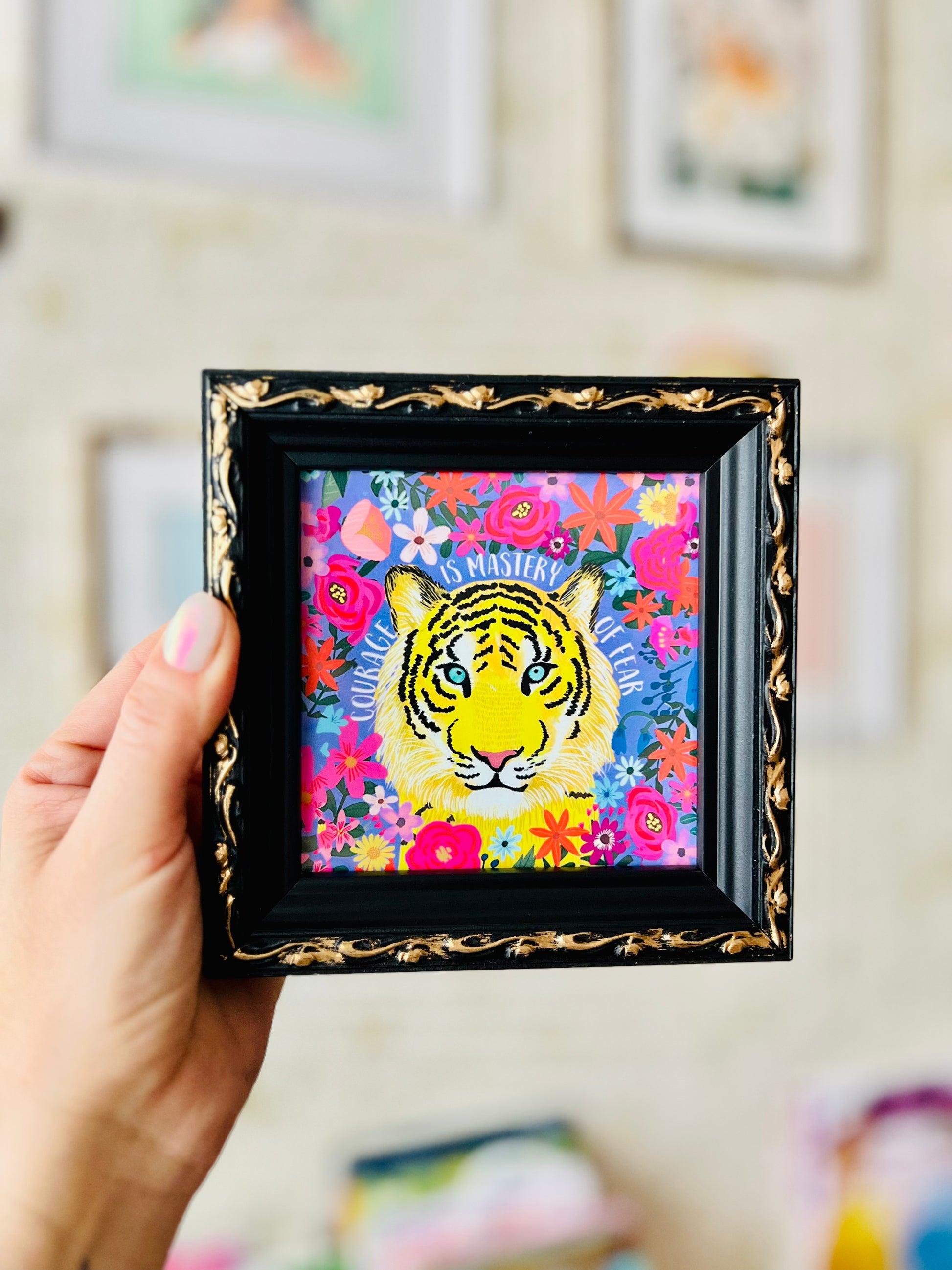 Mini cuadrito con diseño de animales en colores en marco de madera negro con detalles dorados.