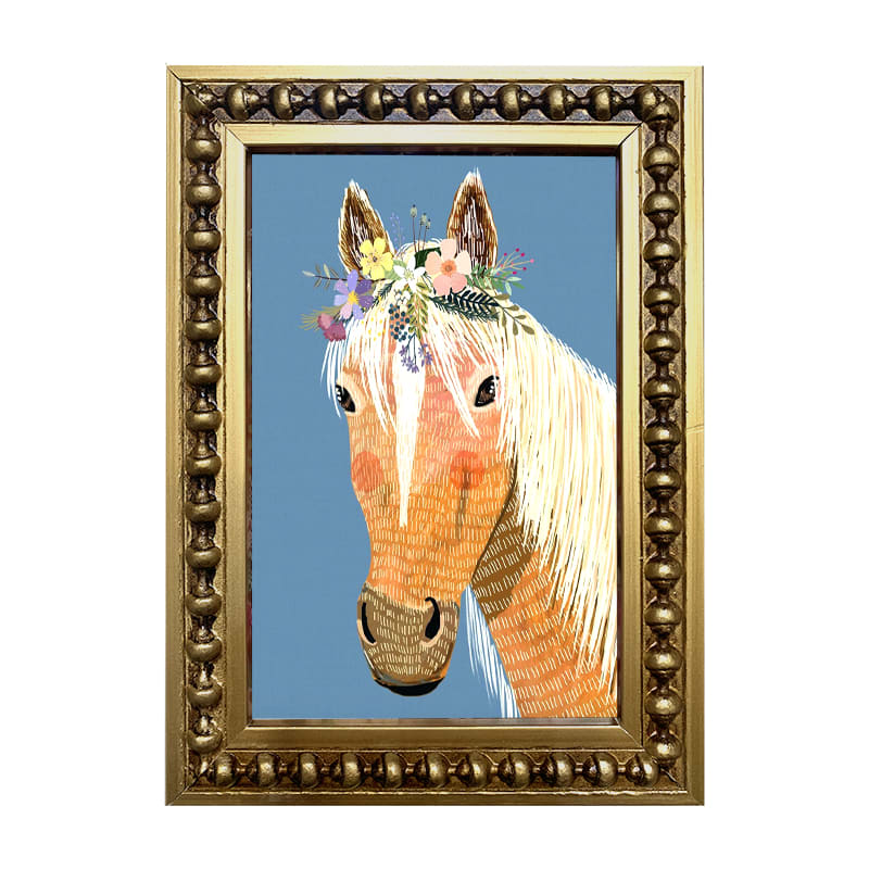 Mini cuadrito de caballo con corona de flores en marco perla dorado.