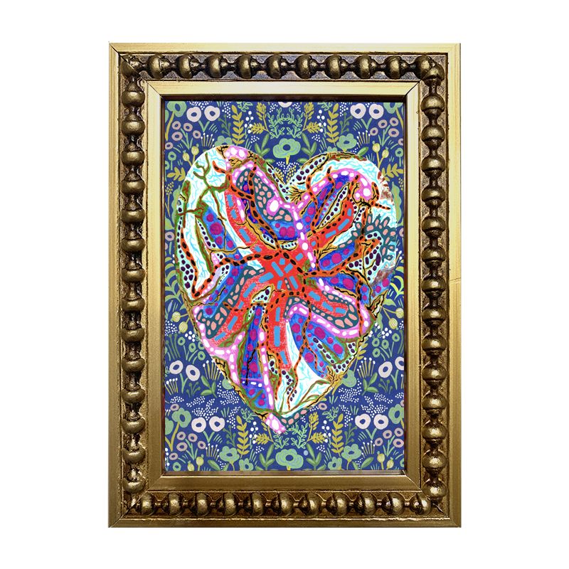 Mini cuadro reproducción de corazón en técnica mixta con marco perla dorado delgado.