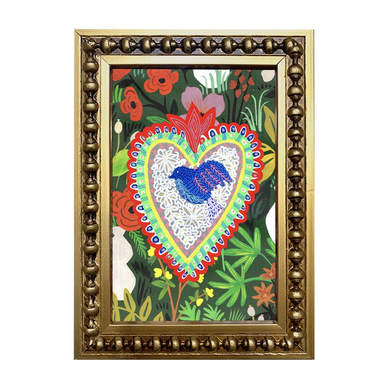 Mini cuadro reproducción de corazón en técnica mixta con marco perla dorado delgado.