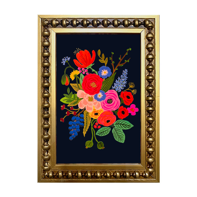 Mini cuadrito de diseño con flores en fondo color azul marino en marco perla dorado.
