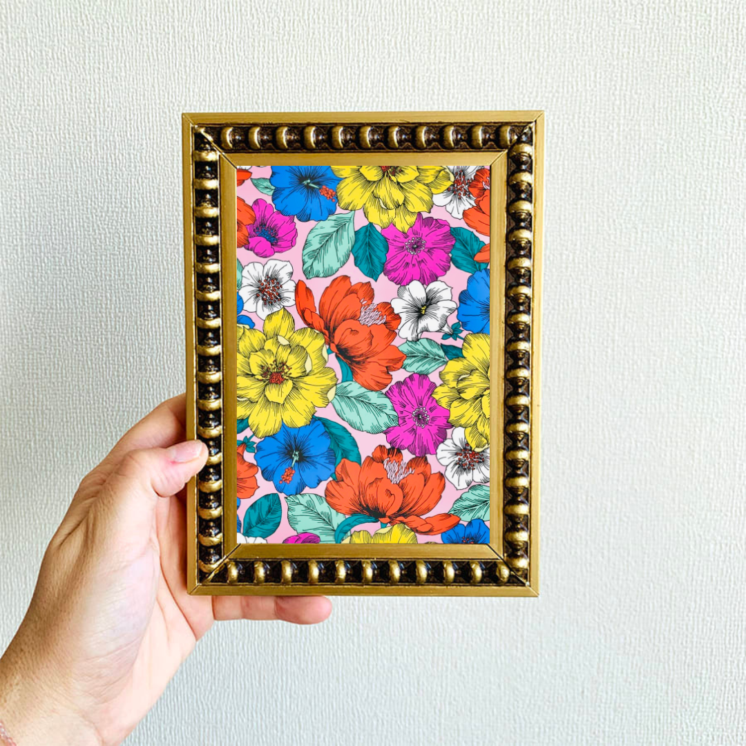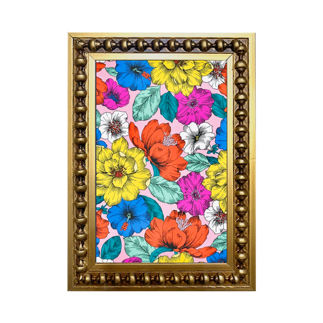 Mini cuadrito de diseño con flores en color con fondo rosa y marco de madera dorado con perlitas.