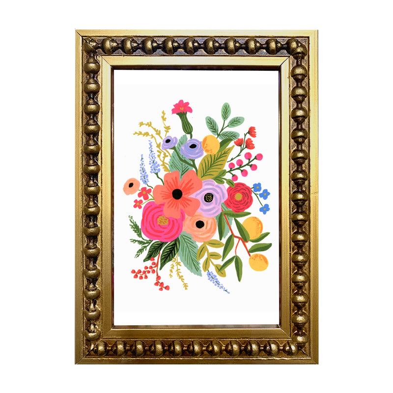 Mini cuadrito de ramo de flores con fondo blanco en marco perla dorado.