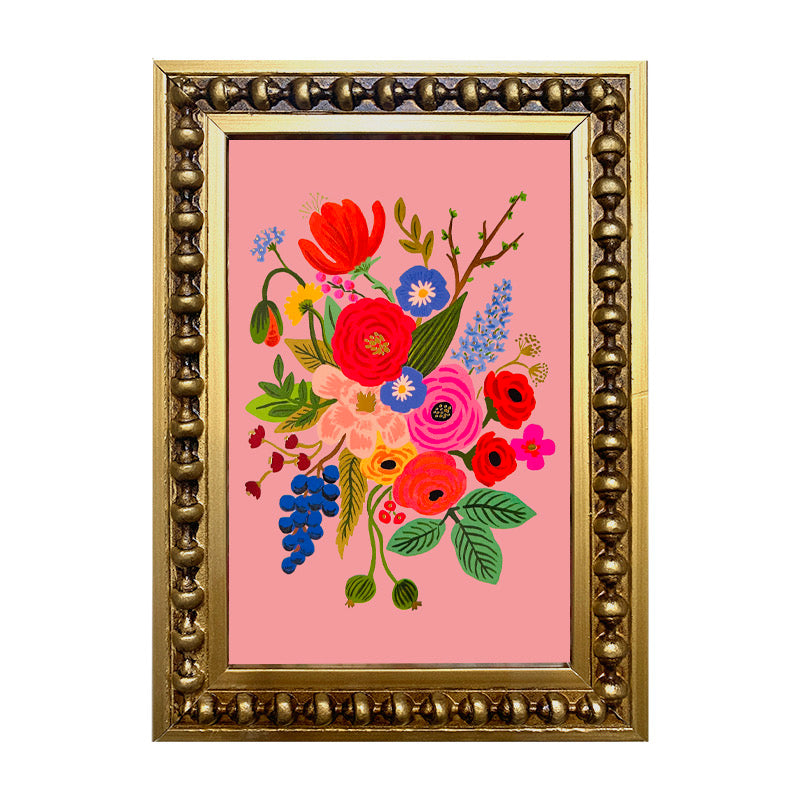 Mini cuadrito de diseño con flores en fondo color rosa pálido en marco perla dorado.