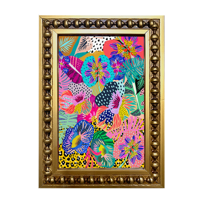 Mini cuadrito de diseño digital impreso en alta resolución, en marco de madera con perlas color dorado.