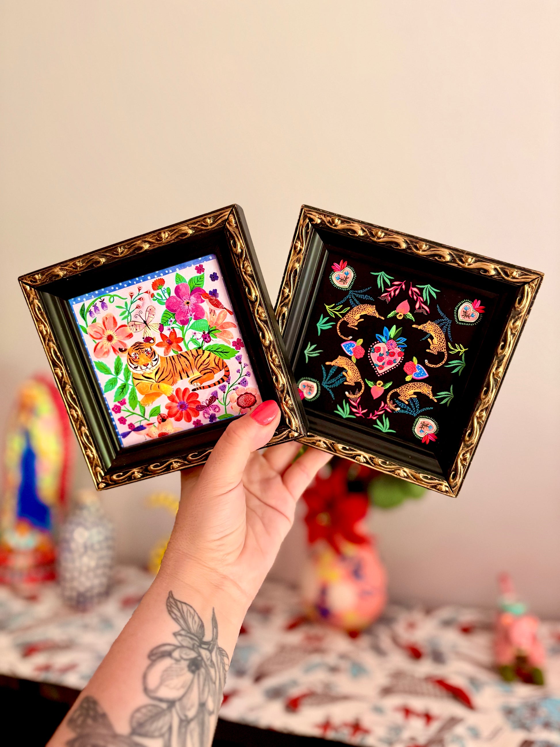 Pack de dos cuadritos con diseños de tigre y leopardos de colores en marco de madera negro con detalles dorados.
