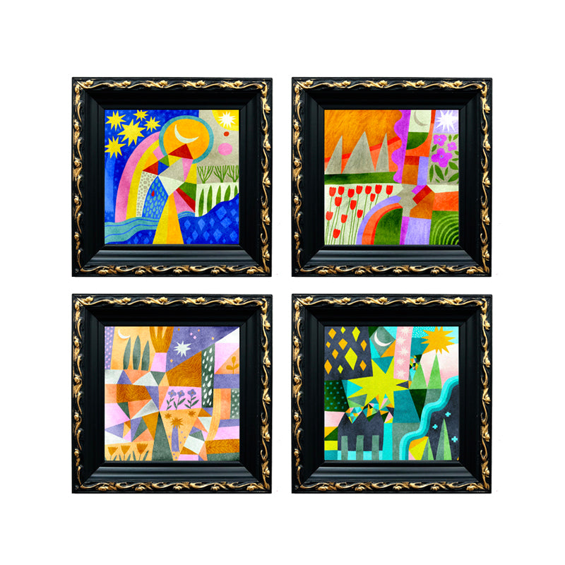 Pack de 4 mini cuadros con diseños abstractos de colores con marco de madera negro con detalles dorados.