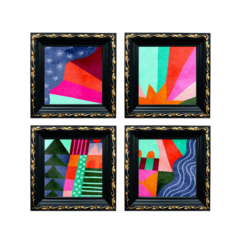 Pack de 4 mini cuadros con diseños abstractos de colores con marco de madera negro con detalles dorados.
