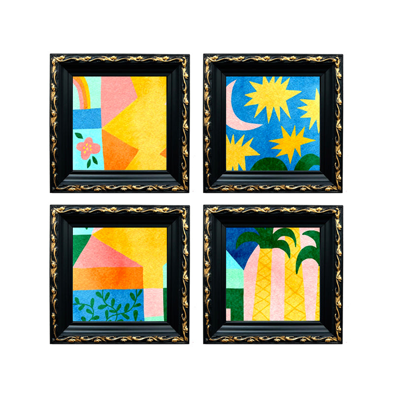 Pack de 4 mini cuadros con diseños abstractos de colores con marco de madera negro con detalles dorados.
