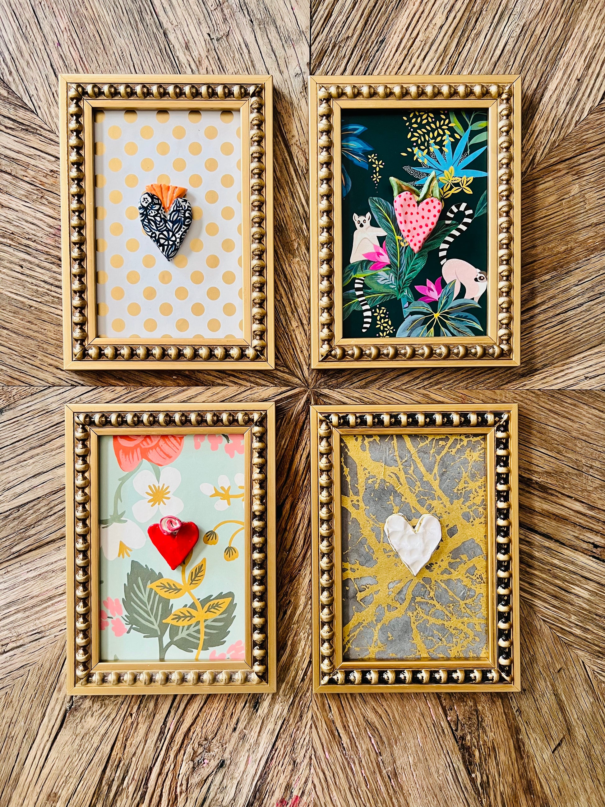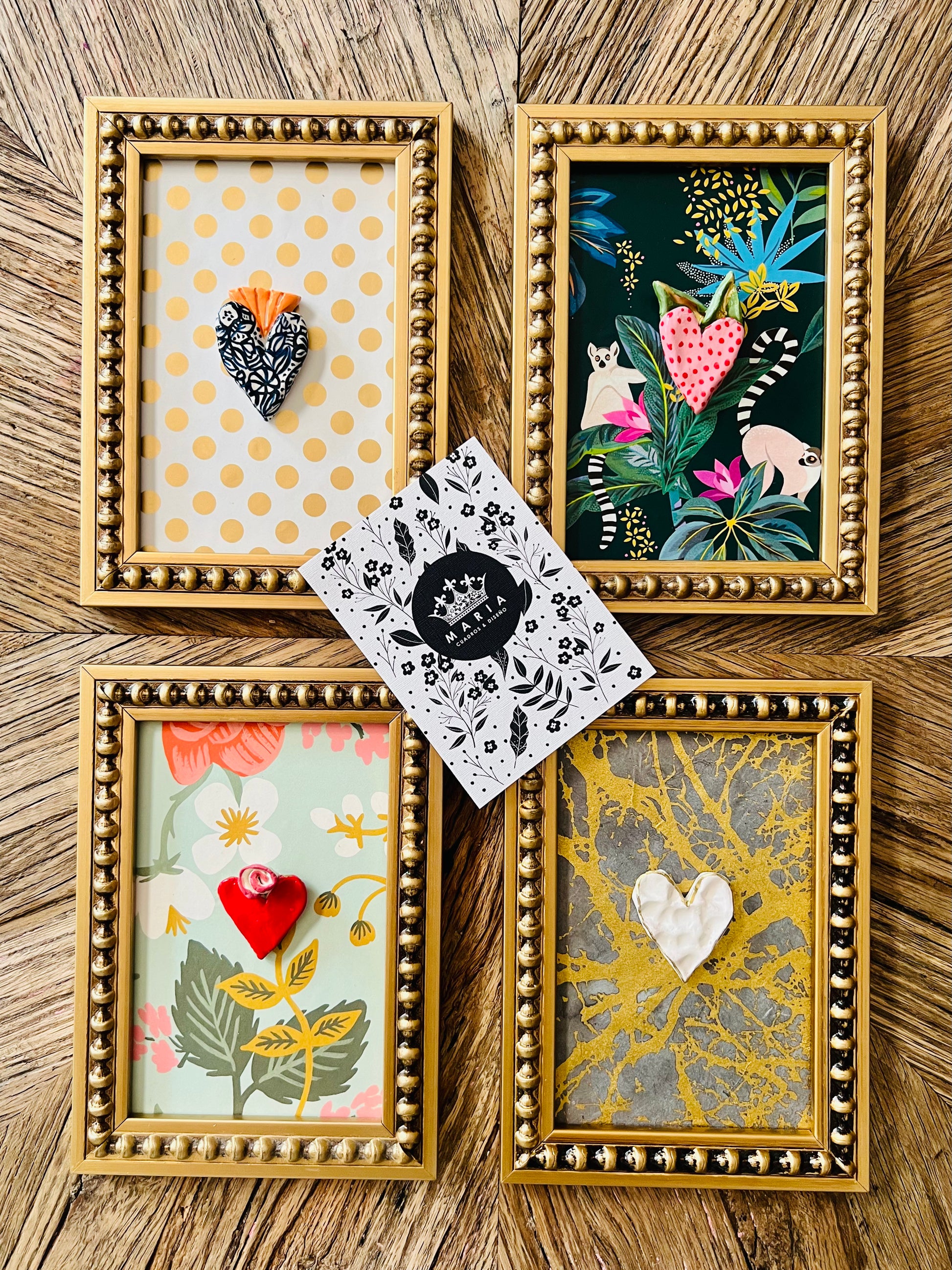 Pack de 4 mini cuadros de corazones de cerámica gres, en fondos de diferente colores con detalles dorados con marco perla.