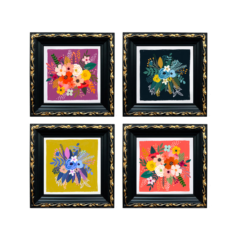 Pack de 4 mini cuadros con diseños de flores de colores con marco de madera negro con detalles dorados.
