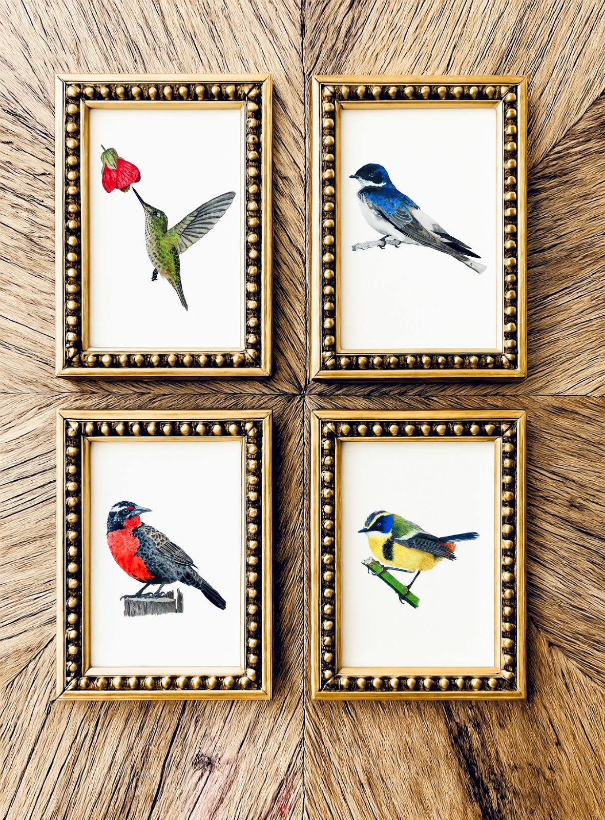 Mini cuadrito de reproducción de dibujo en lápiz y acuarela de Colibrí chileno en marco perla dorado.