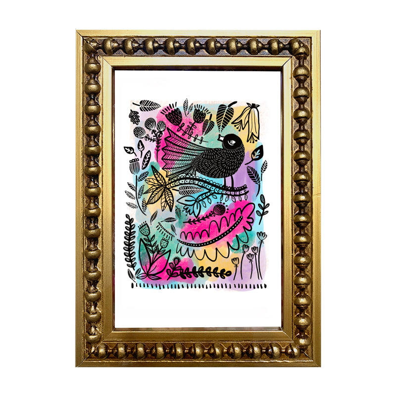 Mini cuadro de pajaritos en técnica mixta en marco perla oro.