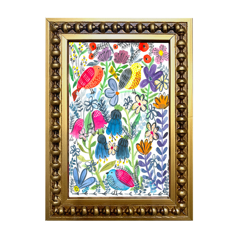 Mini cuadrito de pareja de pajaritos en jardín con flores de colores en marco perla dorado.