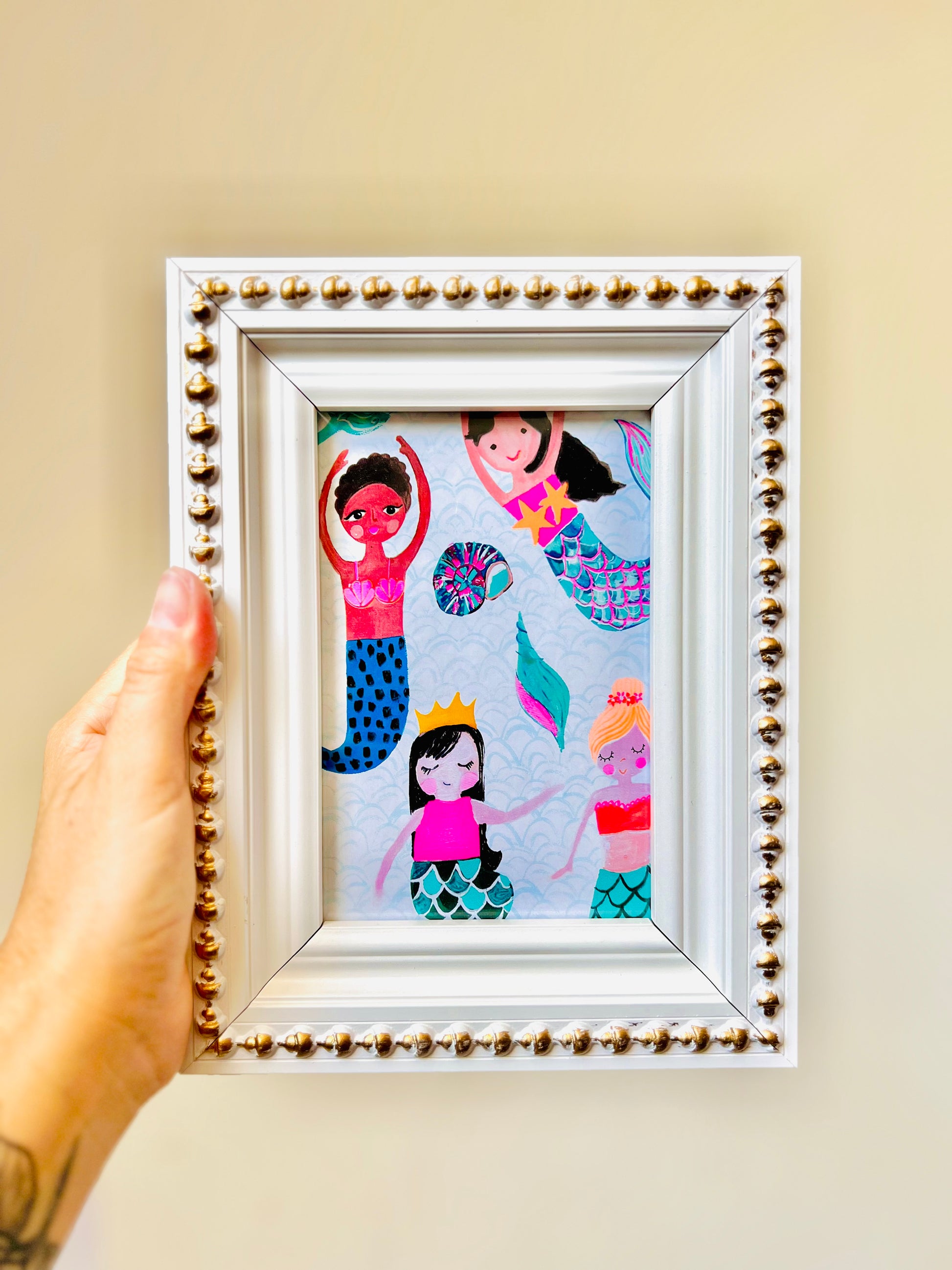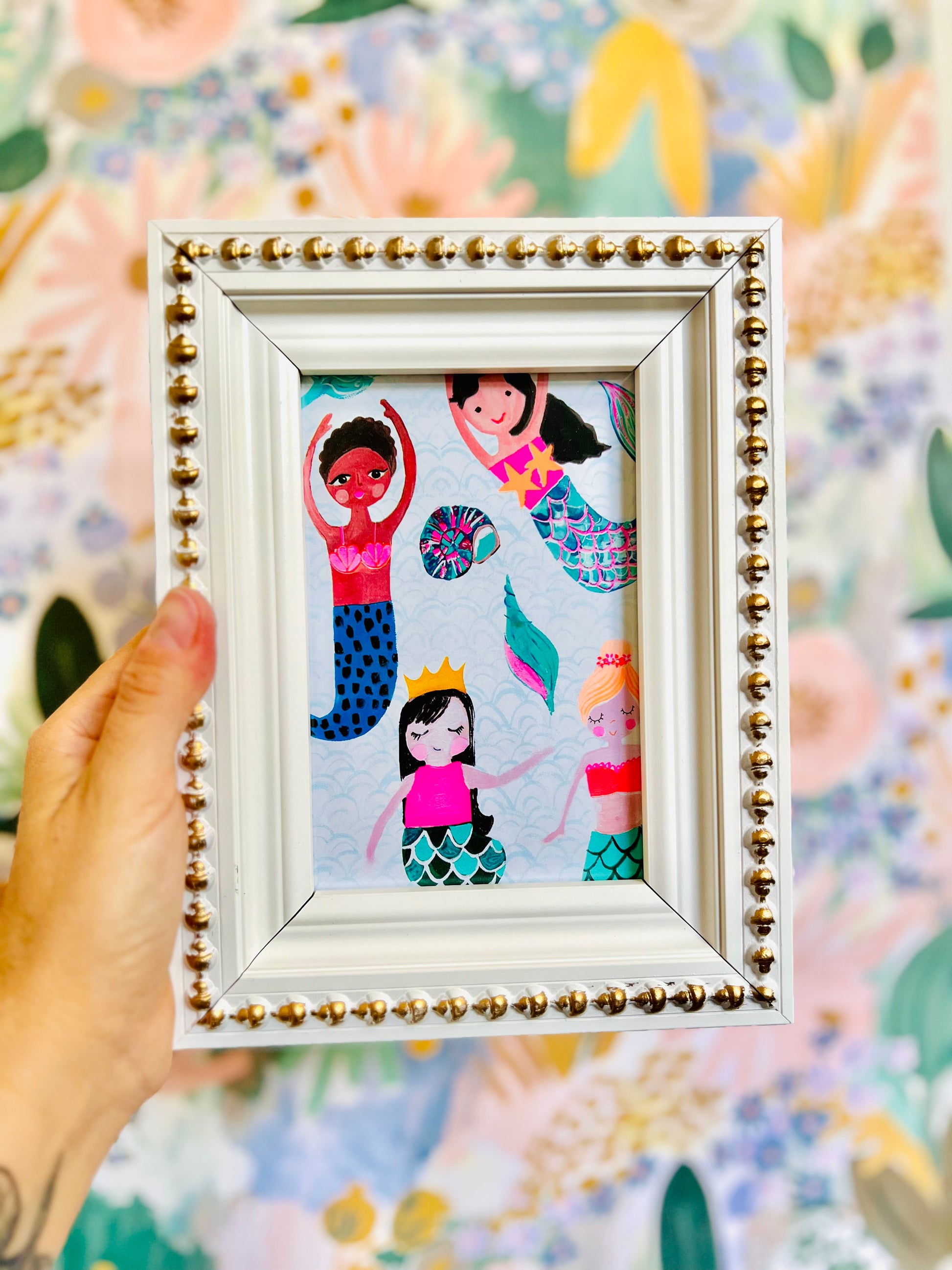 Mini cuadrito de diseño con sirenas en colores en marco blanco con perla dorado.