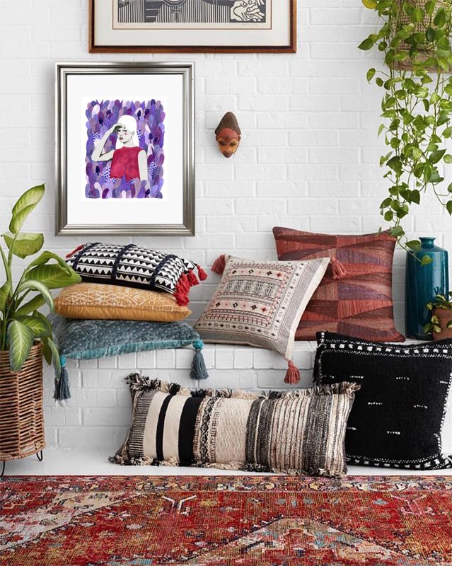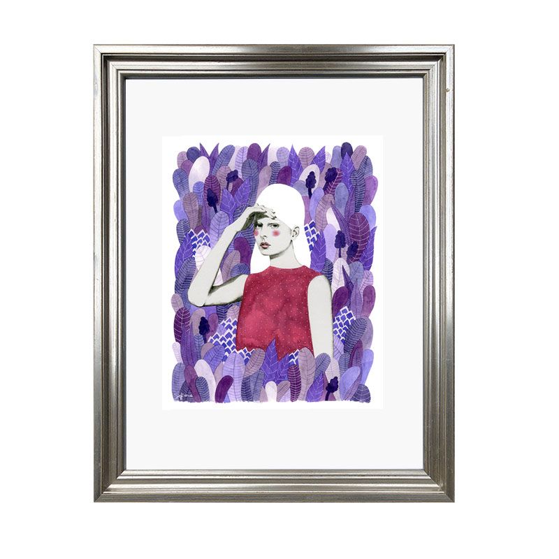 Cuadro reproducción de mujer en hojas, paspartú blanco y marco plata grueso.