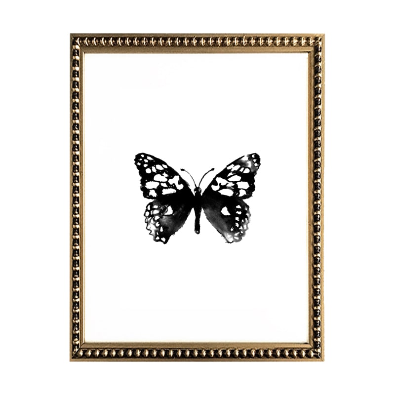 Cuadro reproducción de mariposa en tinta negra y marco de perlas dorado.