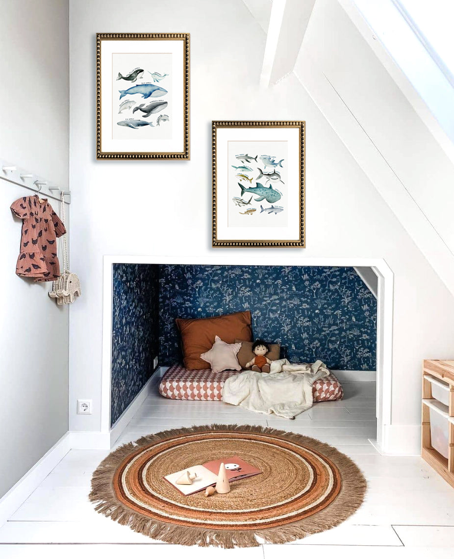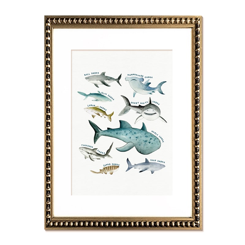 Pareja de 2 cuadros con diseños de ballenas y tiburones, paspartú blanco y marco de madera con perlas color dorado envejecido.