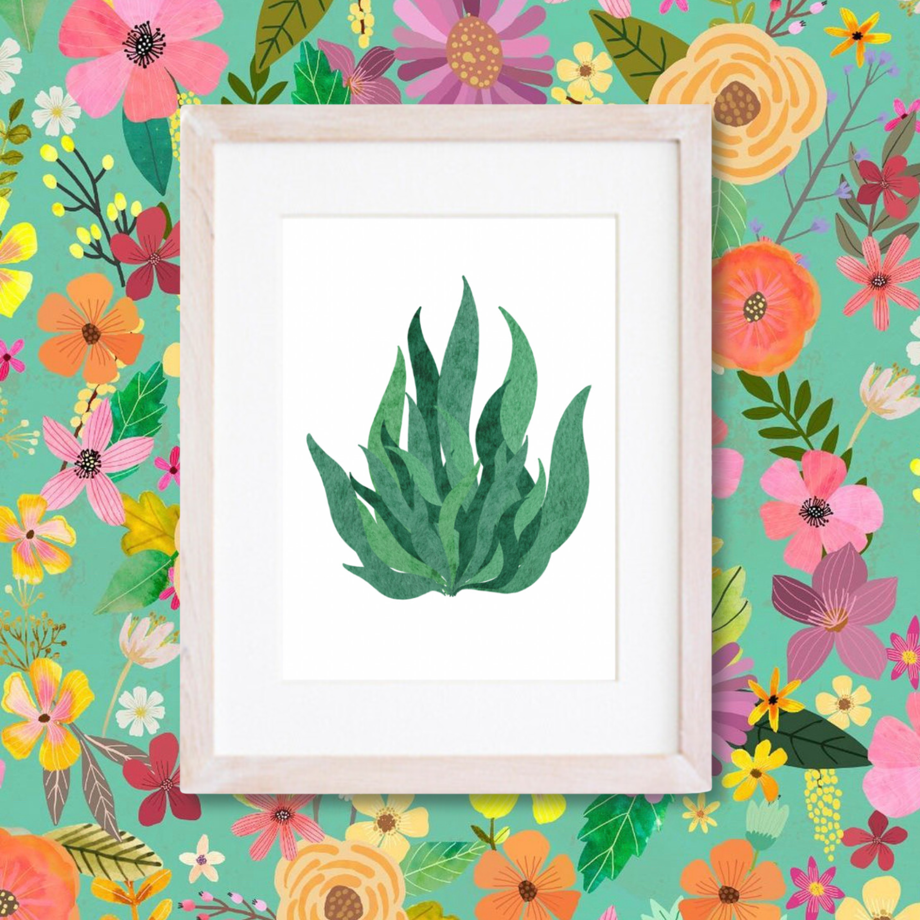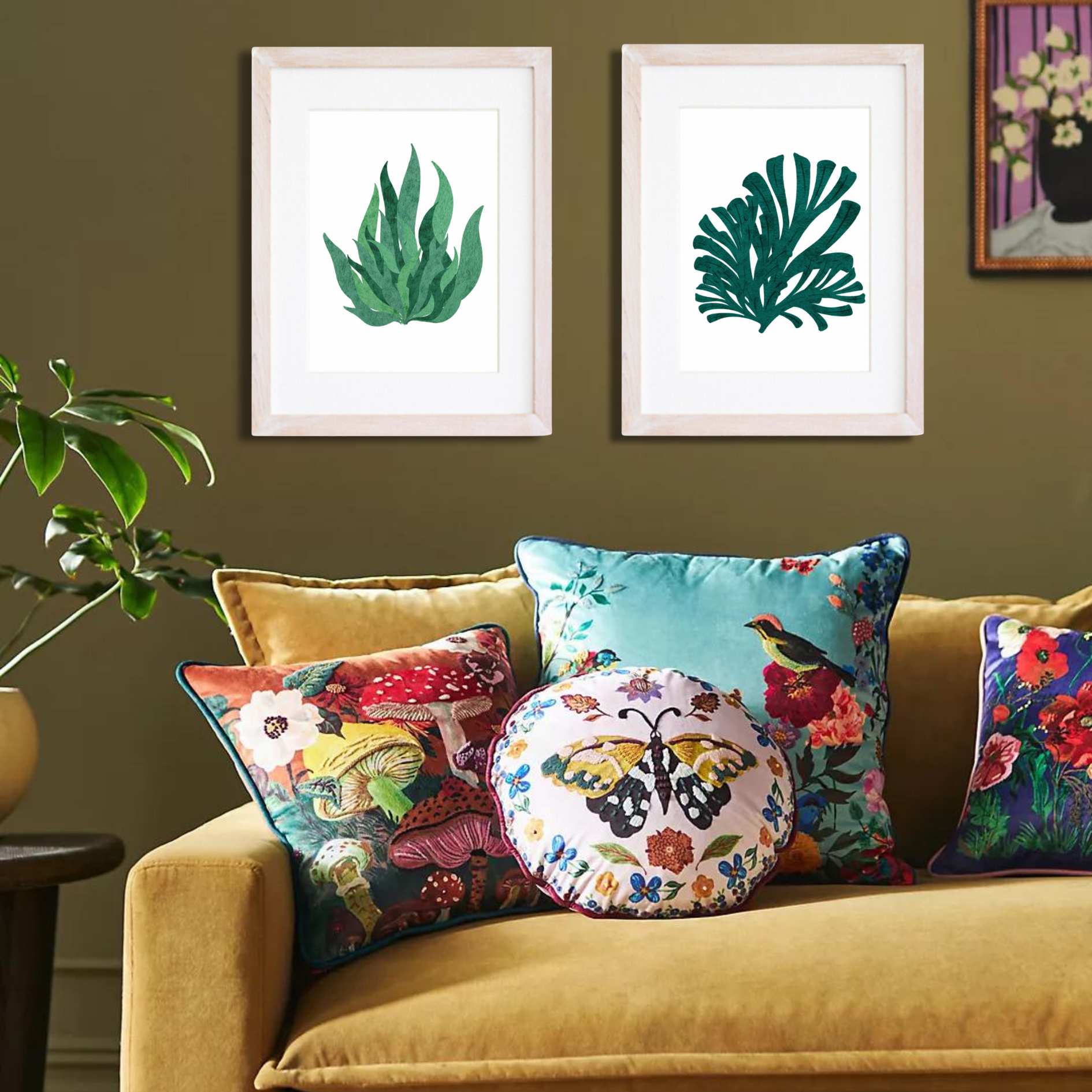 Pack de 2 cuadros con diseño de hojas botánicas en acuarela, paspartú blanco, vidrio y marco de madera albayalde blanco.