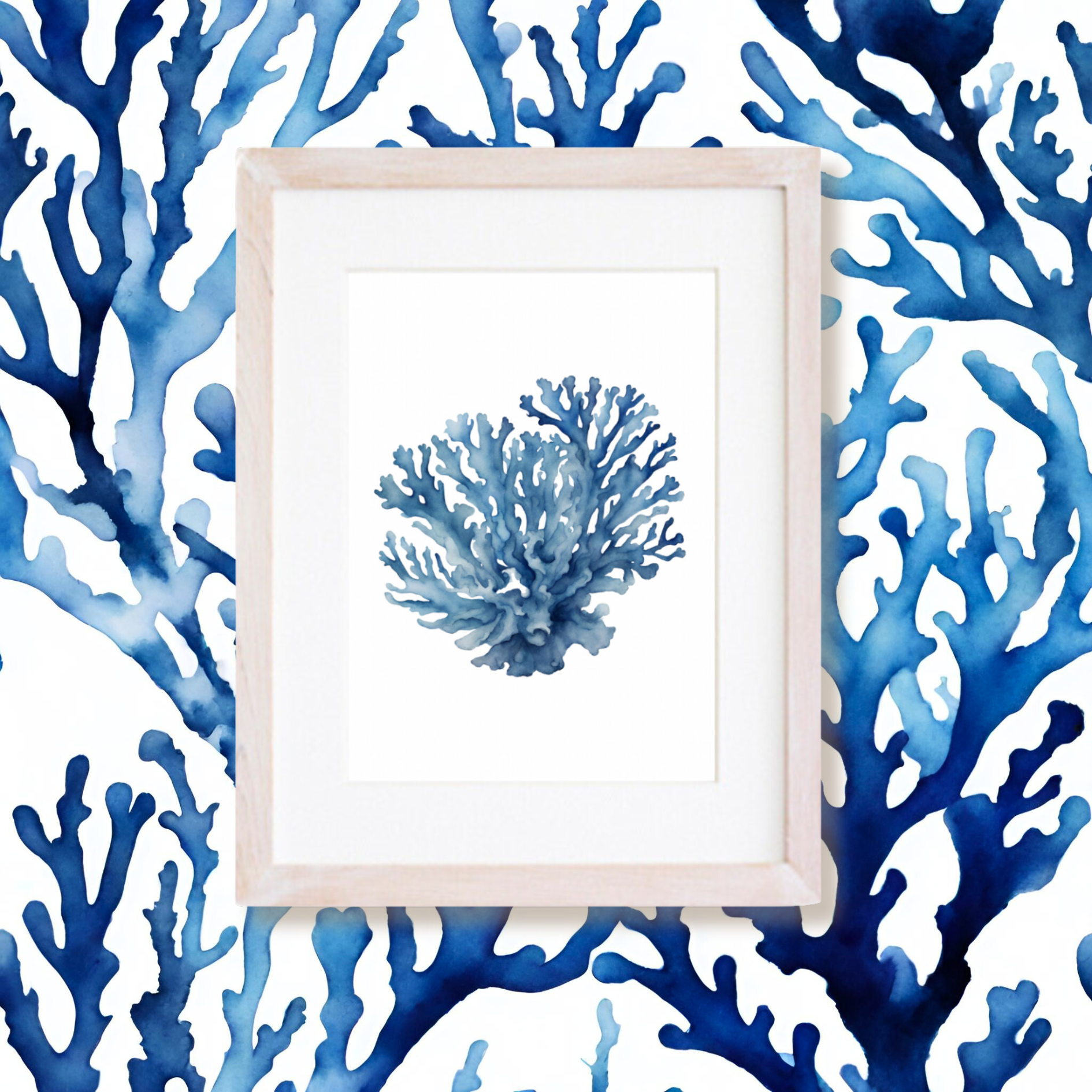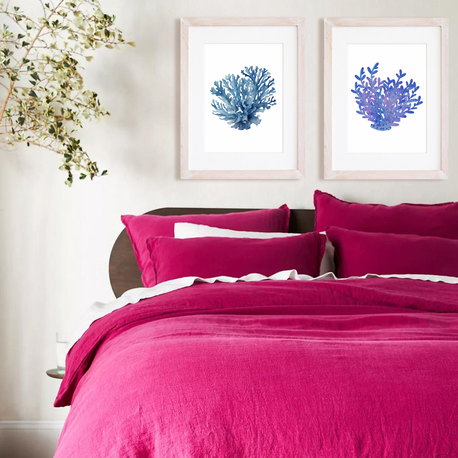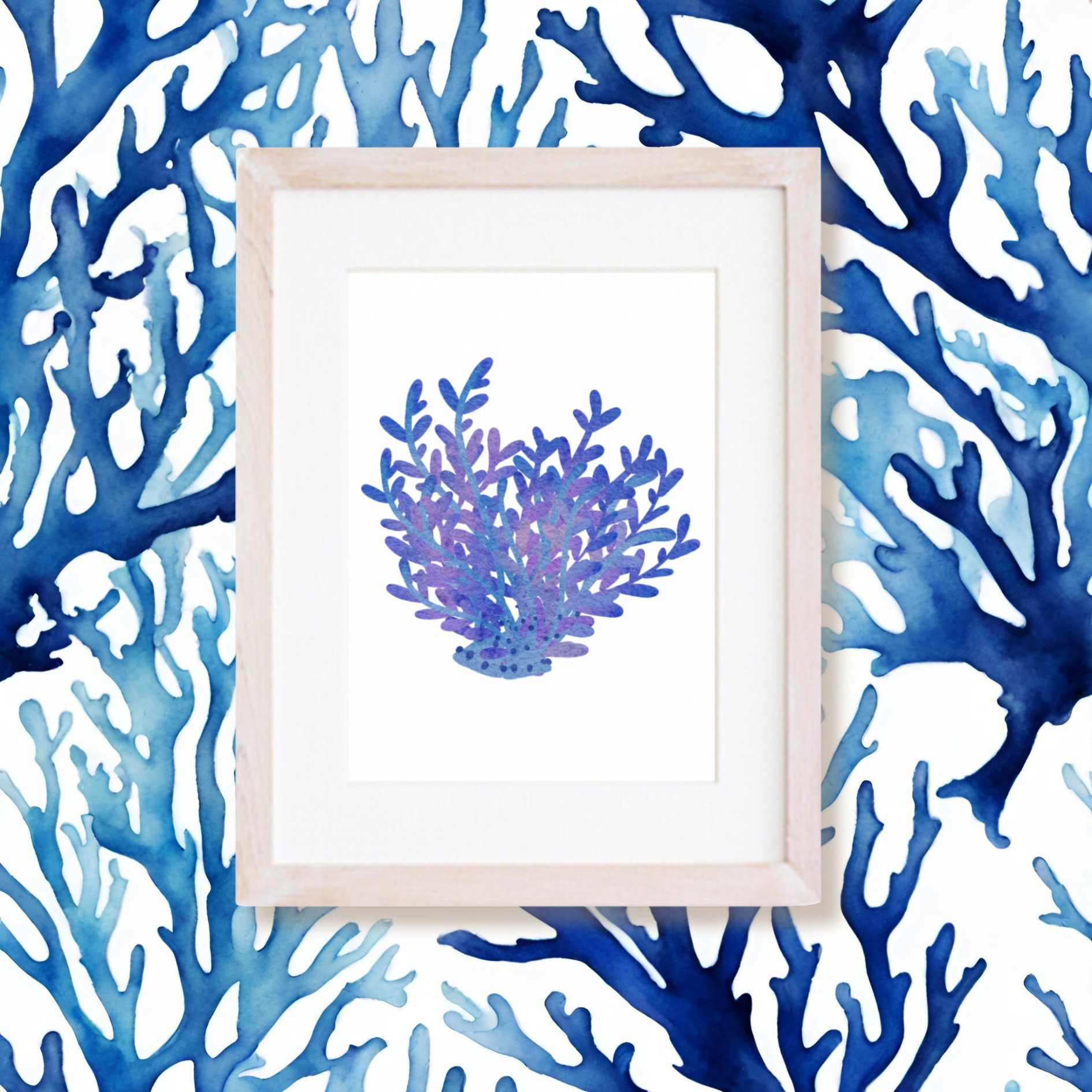 Pack de 2 cuadros con diseño de corales en acuarela color azul y violeta, paspartú blanco, vidrio y marco de madera albayalde blanco.