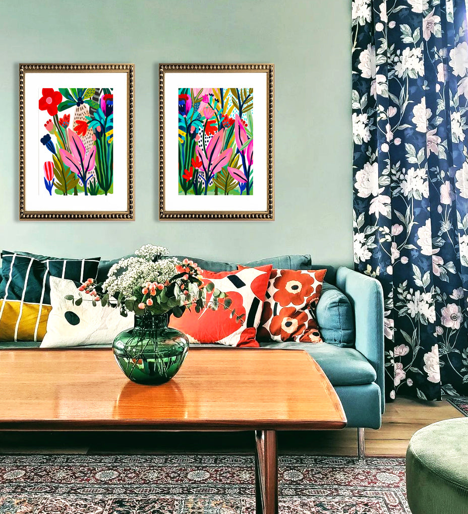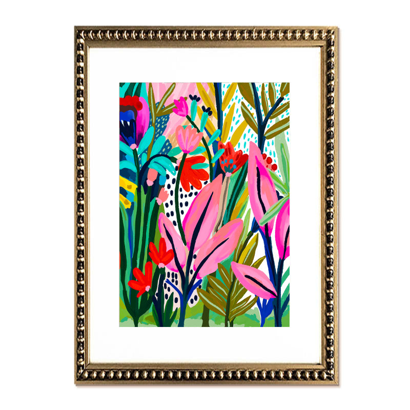 Pareja de cuadros de flores tropicales en colores, paspartú blanco y marco de madera con perlas color dorado envejecido.