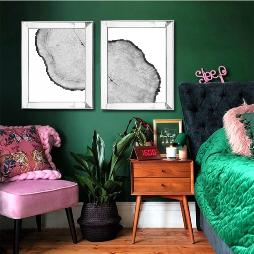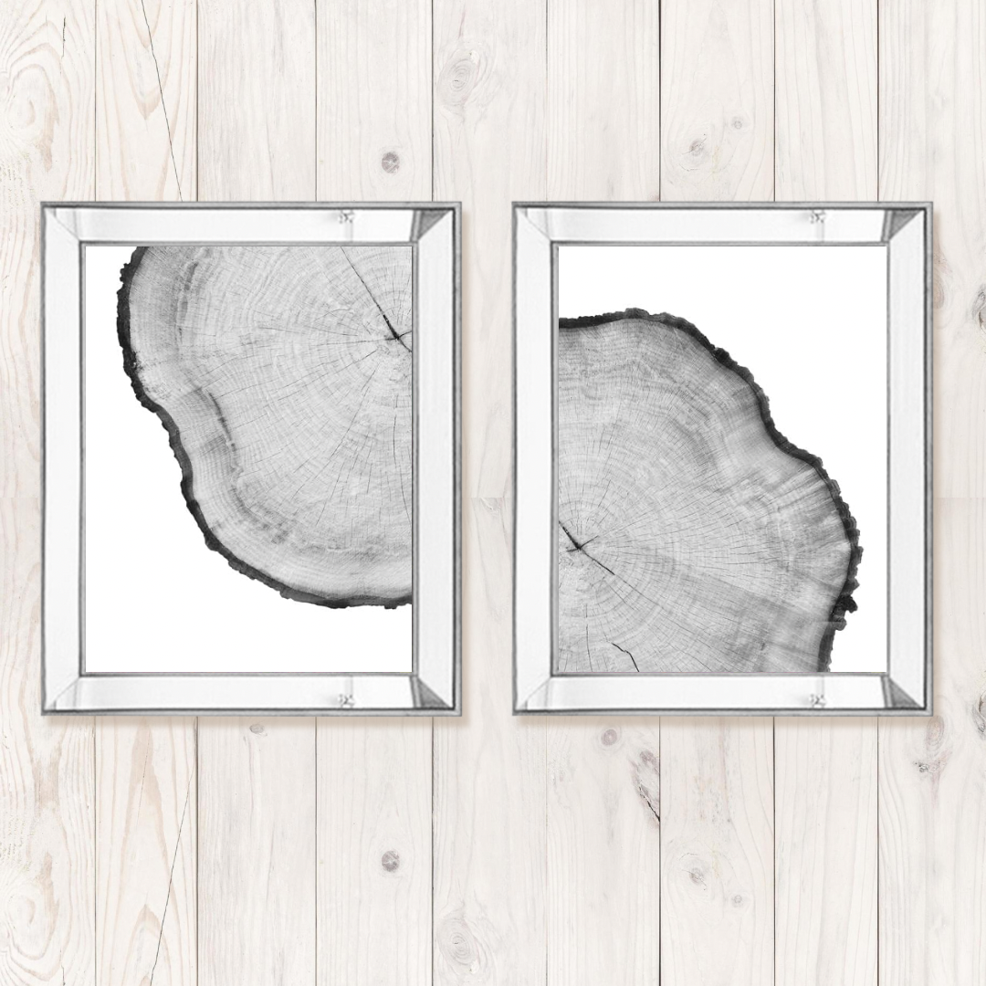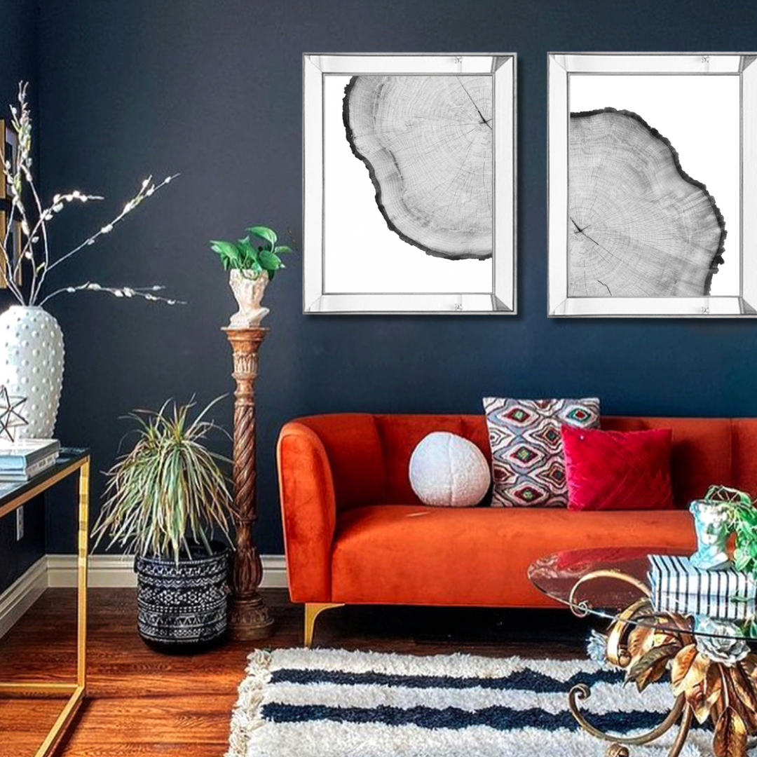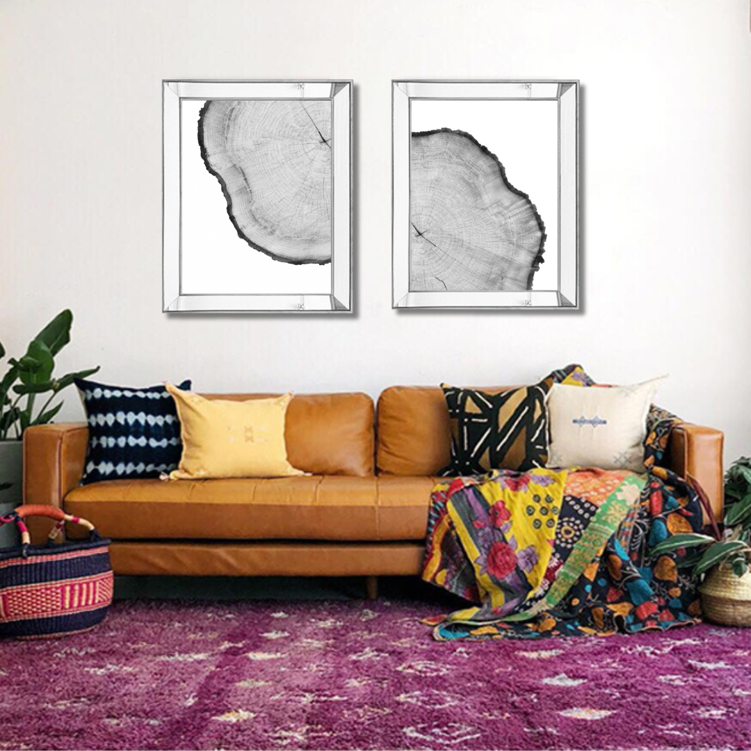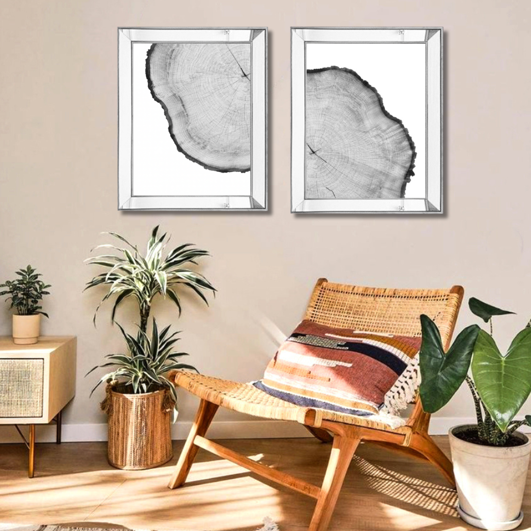 Pack de 2 cuadros con diseño de madera con veta en blanco y negro en marco espejo plata.