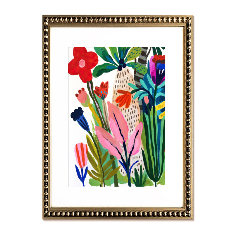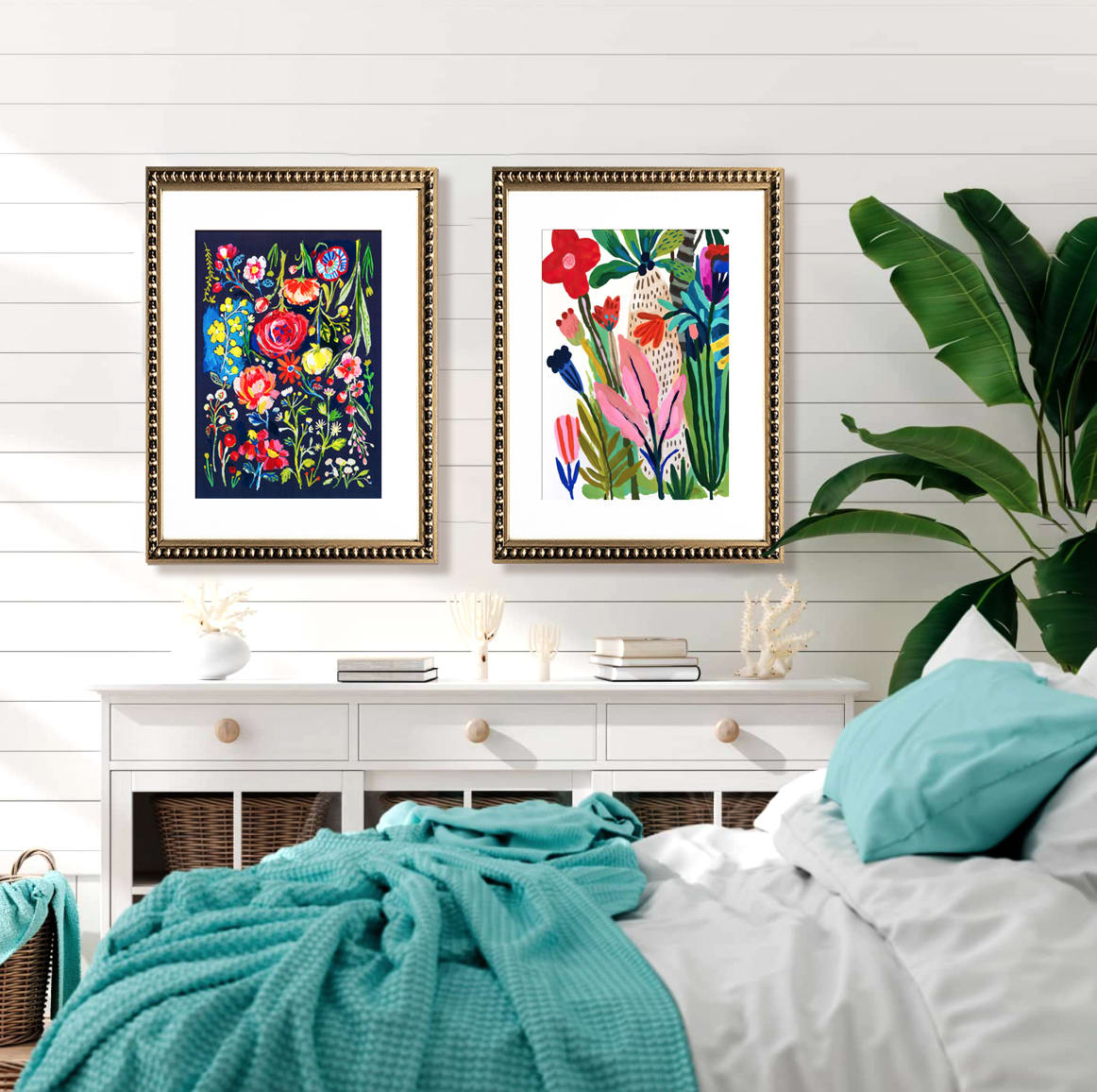 Pack de 2 cuadros con diseños de flores multicolor, paspartú blanco y marco de perlas color dorado.
