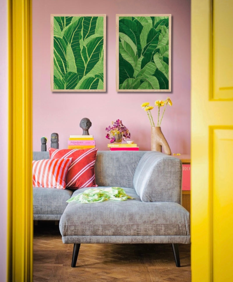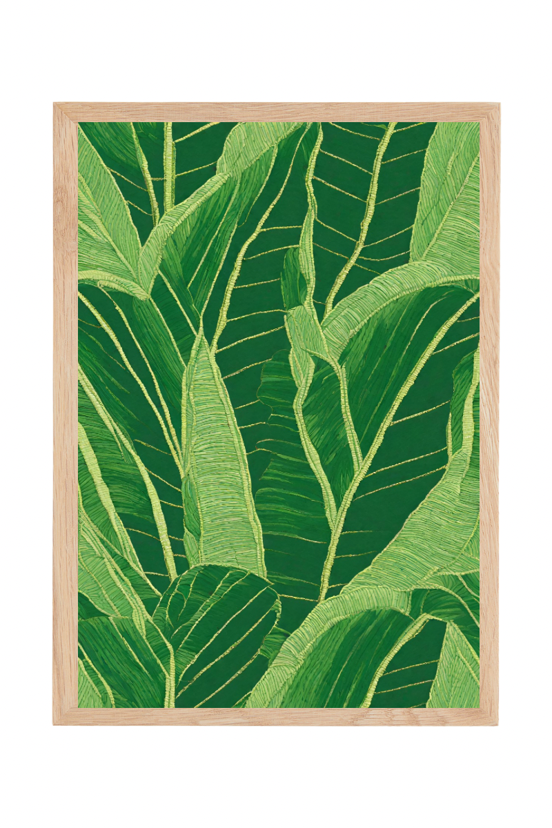 Pareja de cuadros con diseño de hojas de plátano bordadas en marco de madera natural.