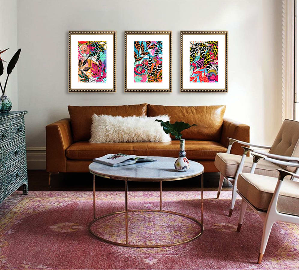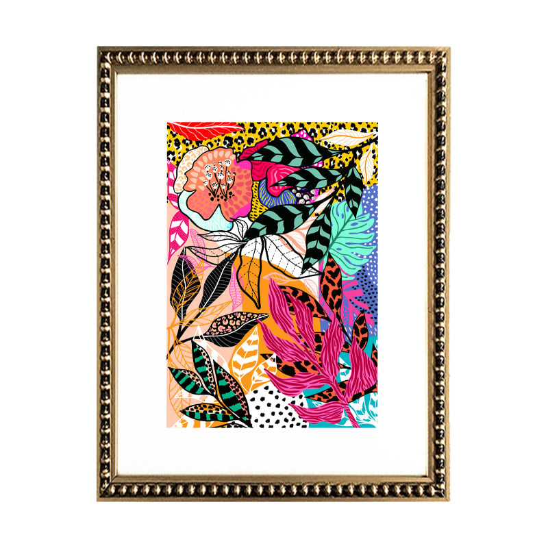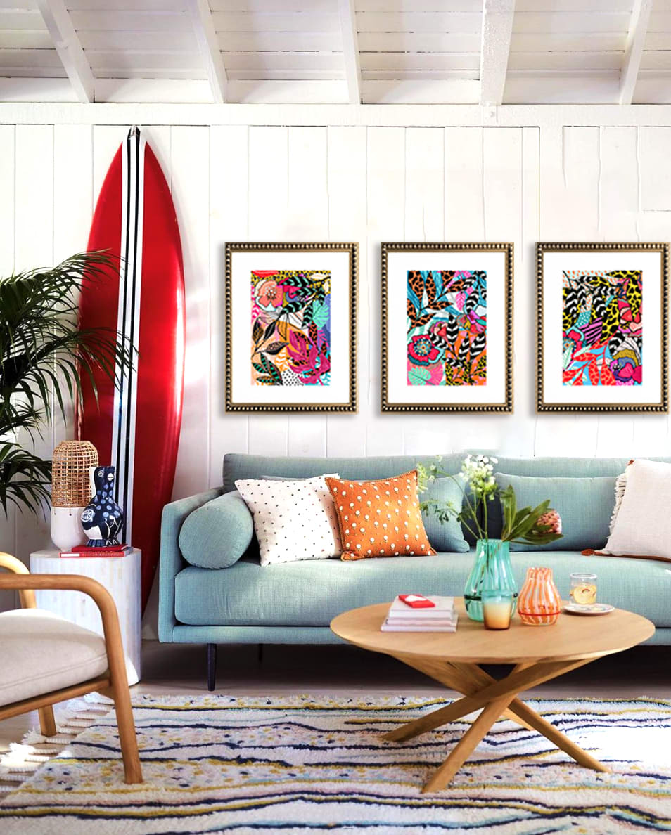 Pack de 3 de cuadros de ilustración digital de flores y hojas de colores. Con paspartú blanco y marco de perlas dorado.