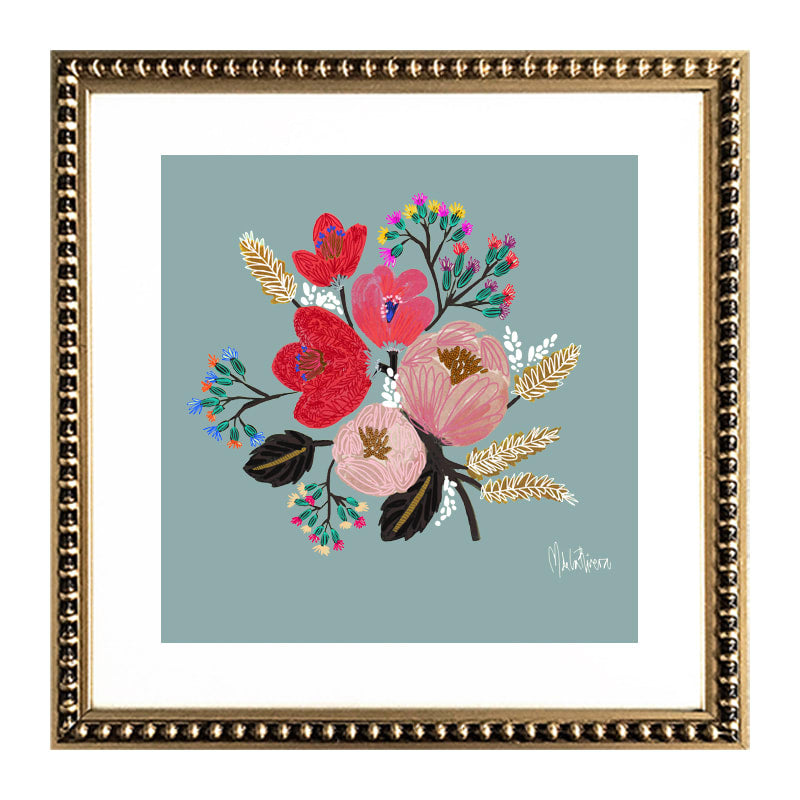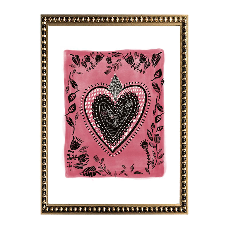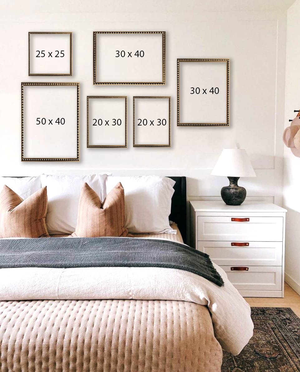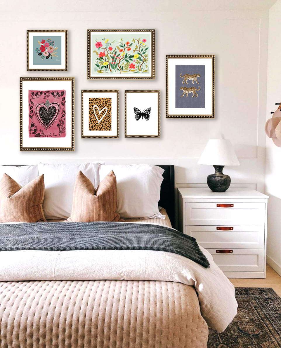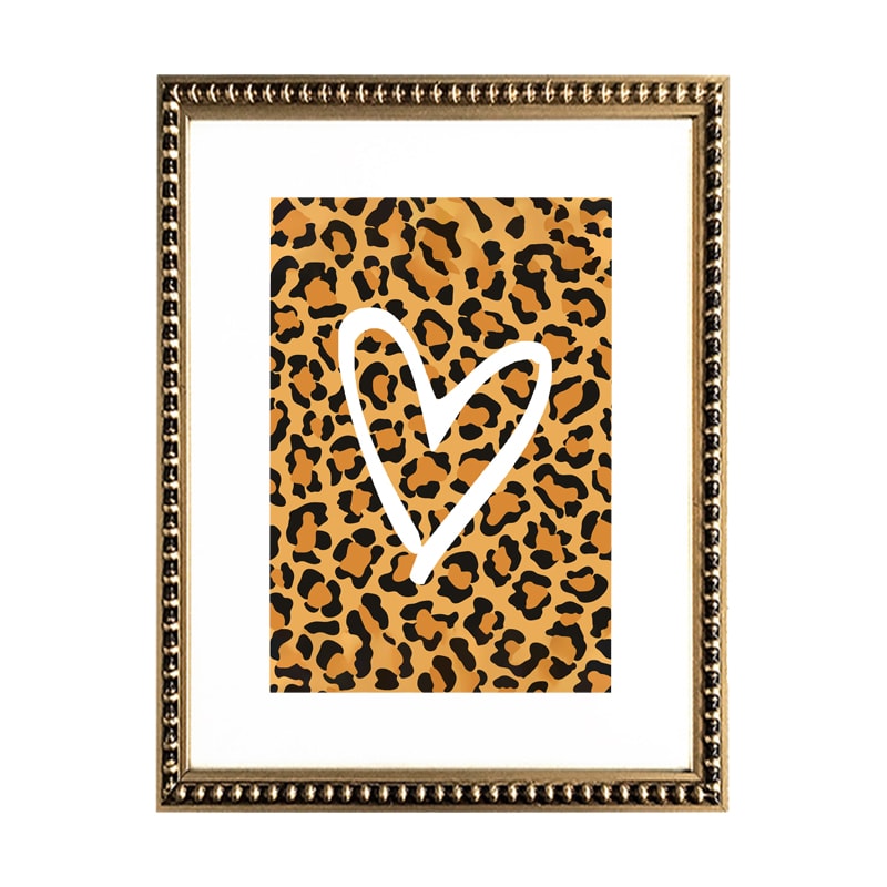 Pack composición de 6 cuadros en tamaños varios con diseños de corazón, flores y leopardo. Todos en marco de madera con perlas dorado.
