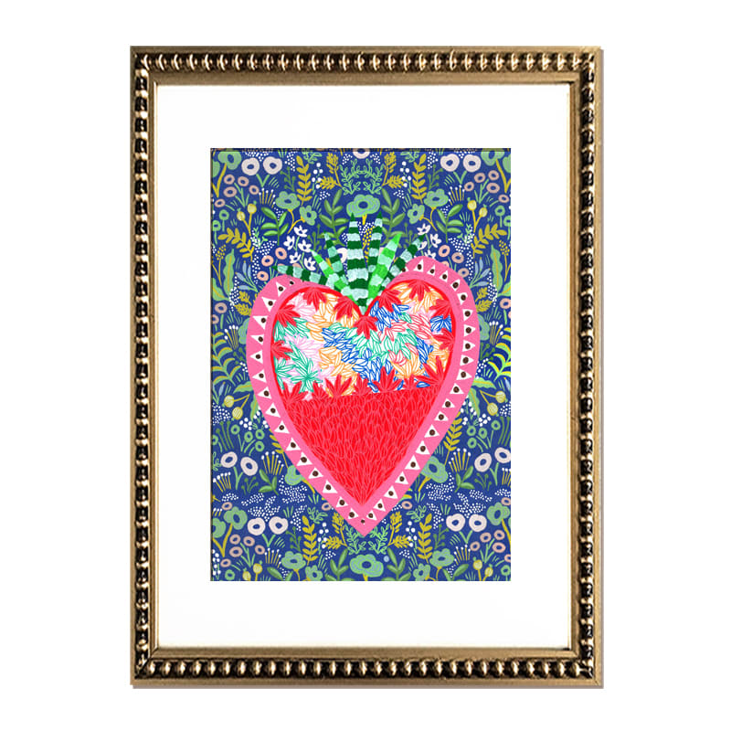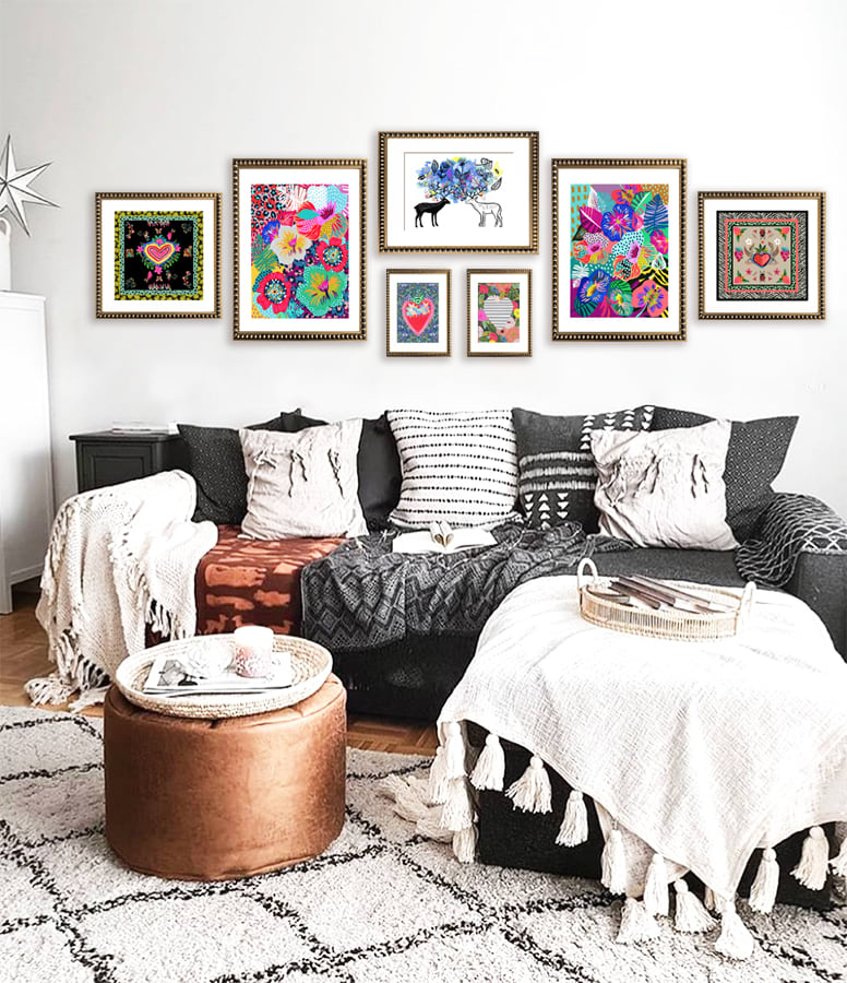 Colección de 7 cuadros en temática natura en colores, con paspartú blanco con marco de madera con perlas en color dorado.