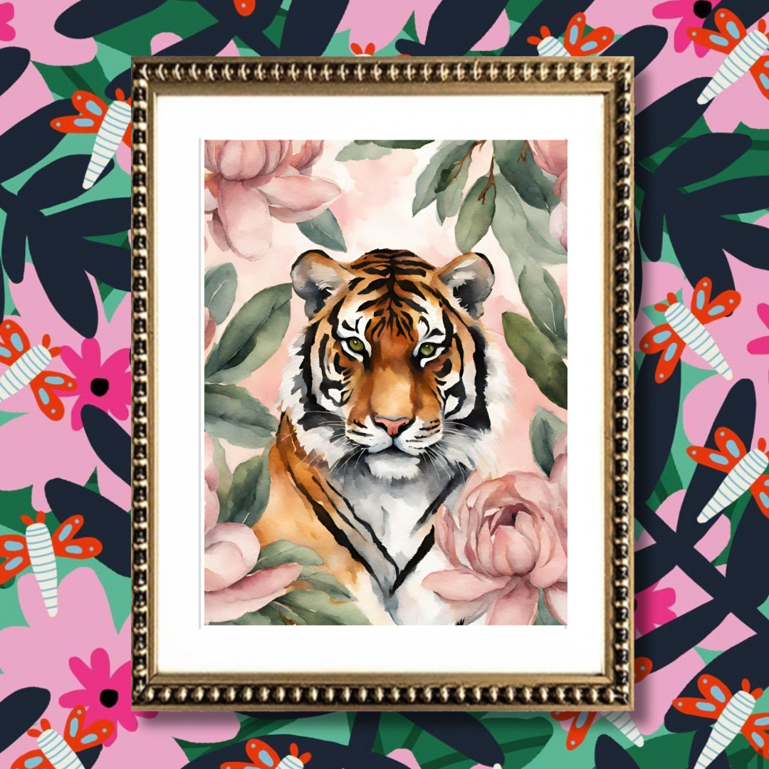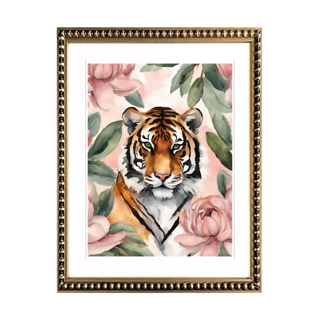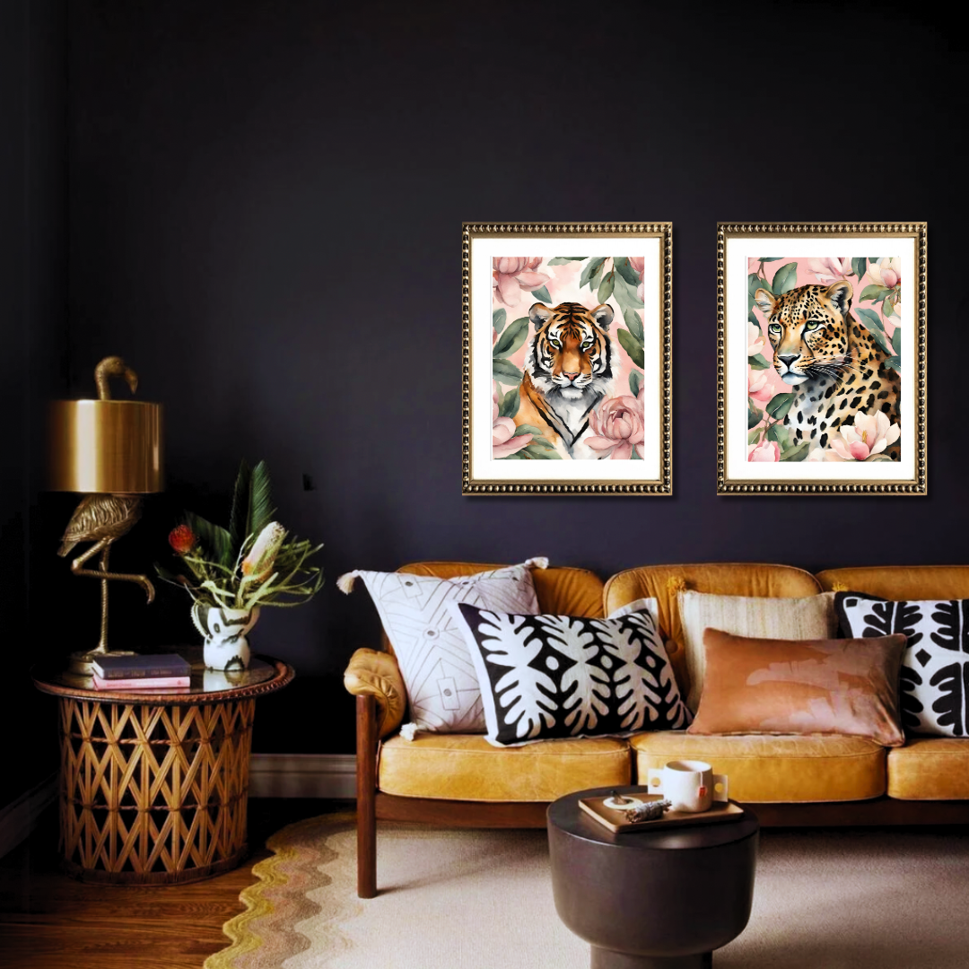 Pareja de 2 cuadros con diseños de tigre y leopardo en fondo de flores rosa, paspartú blanco y marco de madera con perlas color dorado.