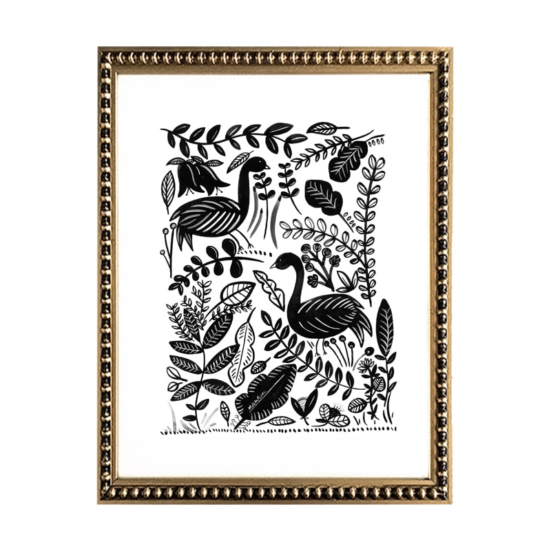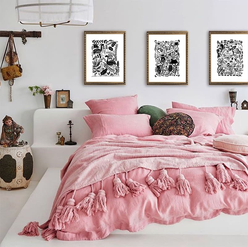 Pack de 3 cuadros de diseños florales y animales en tinta negra con marco perla dorado.