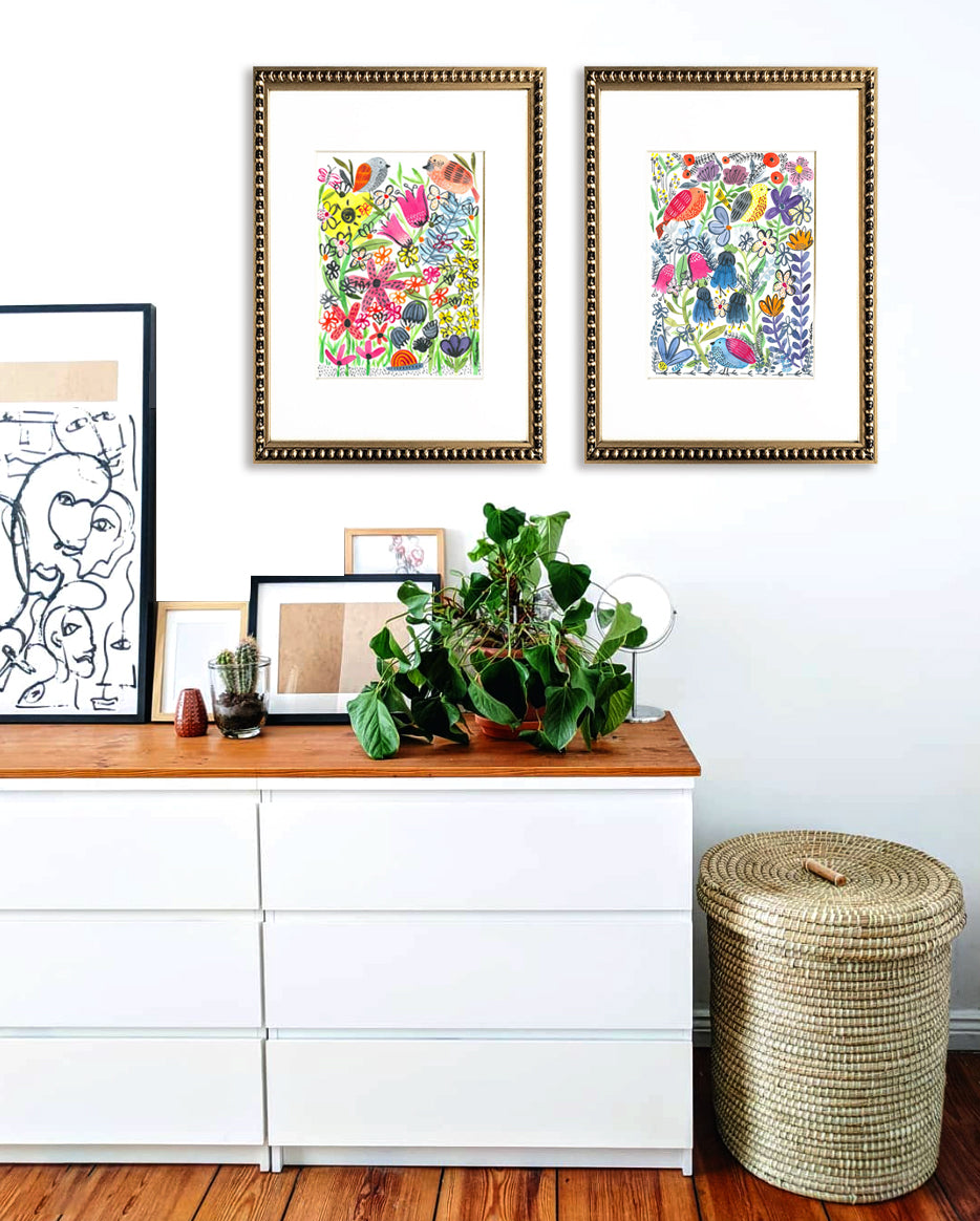 Pareja de 2 cuadros de pajaritos en jardines de colores, paspartú blanco y marco de madera con perlas dorado.