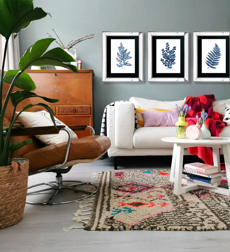 Pack de 3 cuadros con diseños botánicos en azul y blanco, con paspartú negro y marco espejo con borde color plata.